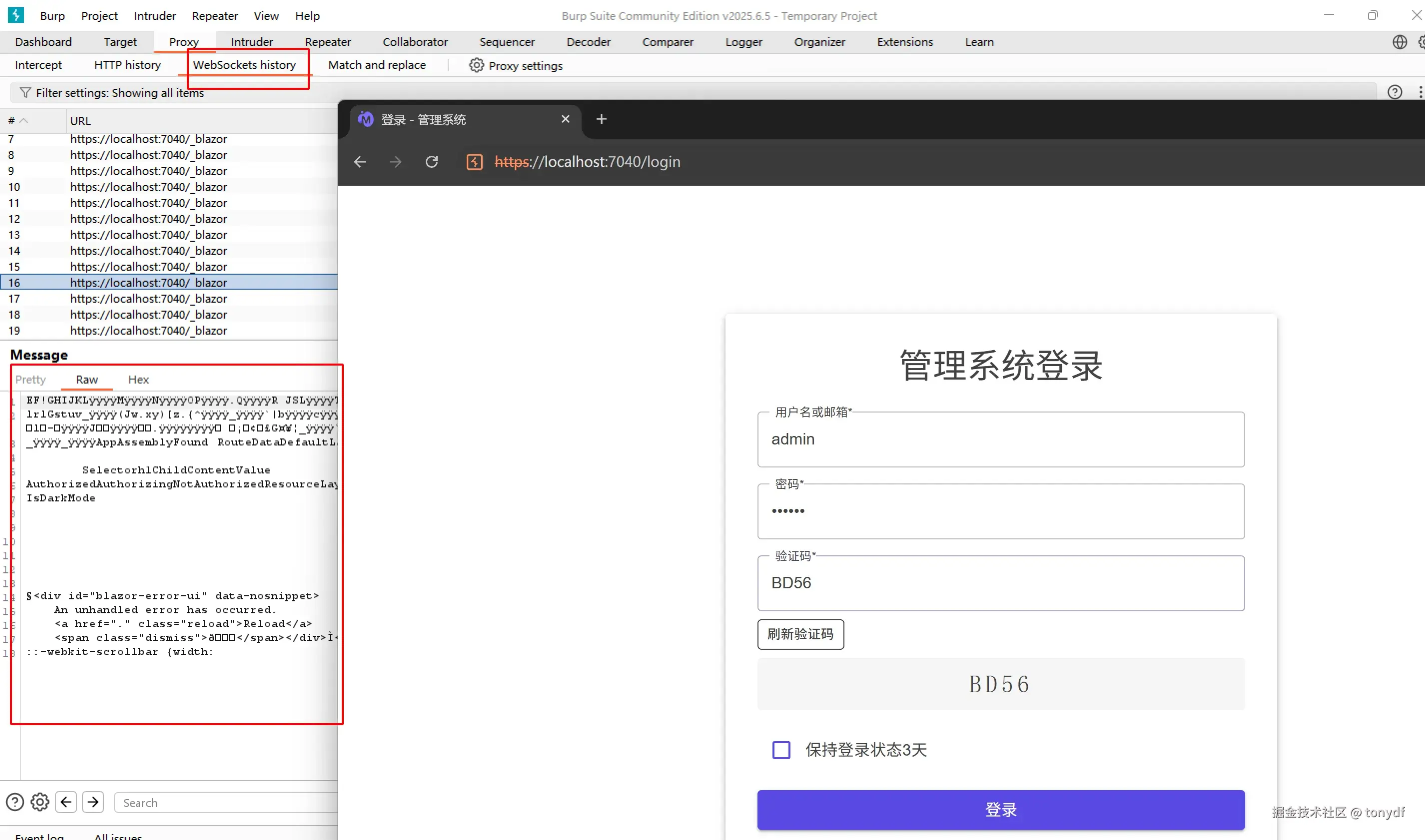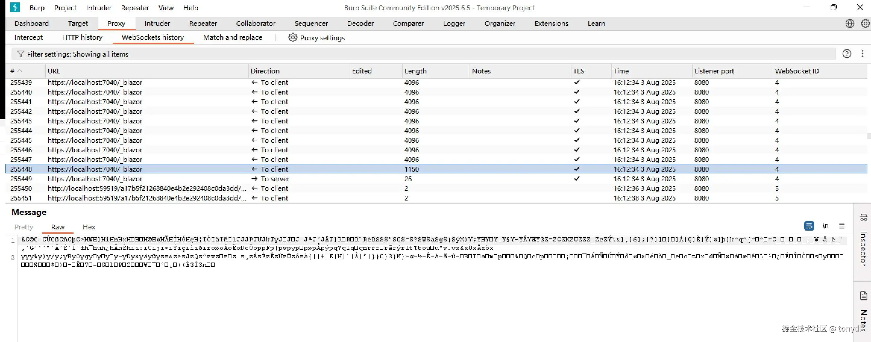 这里connect那个是ide建立的做热重载用的,实际生产环境环境不会有这个套接字,实际产生数据交互,也就是服务端控制web端页面变化的套接字就是_blazor的那个,我们可以打开burp看一下它的请求历史,全部都是加密之后的字符,也就是说,这整个的数据交互过程都是安全的。