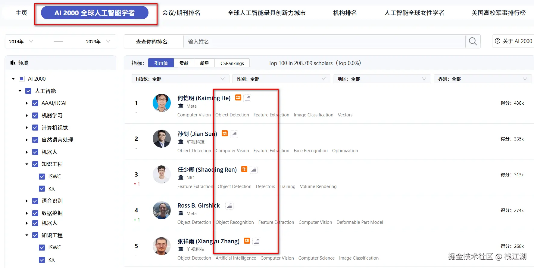 可以看到AI2000人工智能全球最具影响力学者榜单中top5就有4位是华人。