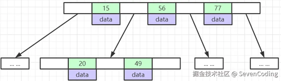 - 叶子结点包含了所有的索引字段,以及数据的磁盘地址,而非叶子结点不再存储data数据,作用只是便于查找的冗余索引