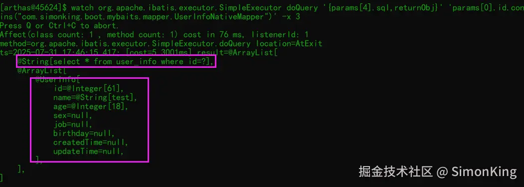 watch org.apache.ibatis.executor.SimpleExecutor doQuery '{params[4].sql,returnObj}' 'params[0].id.contains("xxx.xxxMapper")' -x 3