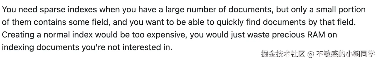 稀疏索引(或者称间隙索引)就是只包含有索引字段的文档的条目,跳过索引键不存在的文档