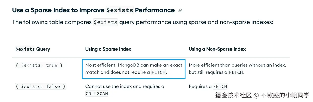 { 被索引键:{$exists:false}},不会使用该稀疏索引,除非显示指定hint({被索引键:1})