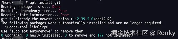 - 再次,使用命令安装git(也有其他方式安装,这里只讲述apt方式)