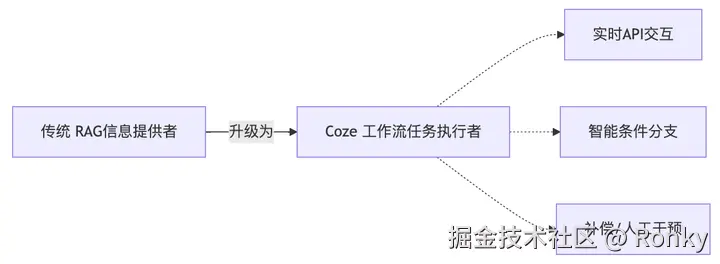 由于Coze提供了工作流、插件等等能力于一体,当 RAG 知识库被嵌入 工作流(Workflow) 后 系统升级为 “感知-决策-执行”的自主智能体:
