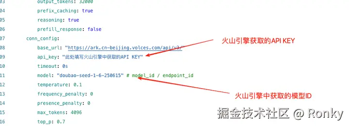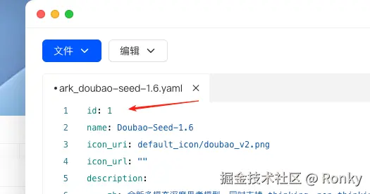 - 双击编辑“ark_doubao-seed-1.6.yaml”文件,主要修改3处:id、api_key、model
