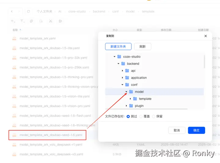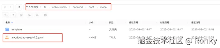 - 将“个人文件夹>AI>coze-studio>backend>conf>model>template"文件夹中的“model_template_ark_doubao-seed-1.6.yaml“文件复制到"个人文件夹>AI>coze-studio>backend>conf>model"目录中,并重命名为“ark_doubao-seed-1.6.yaml”