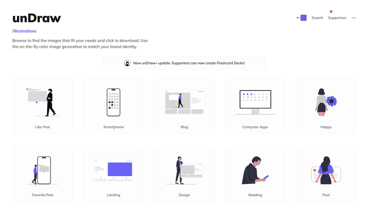 一个开源的插图分享网站,可以直接下载svg/png插画素材,完全免费使用且无需注明出处,自动自定义颜色以匹配您的品牌并将其用作普通图像、嵌入代码或直接用于您的设计工作流程。