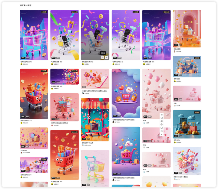 如上图所示,当你发现一个「电商」素材,希望找到更多类似风格的素材时,就可以直接在素材预览图上点击「找相似」,站酷素材能够快速聚合所有类似素材,见下图,快速明确心中想要;你还可以根据编辑提供的联想词、相似素材推荐加速浏览。