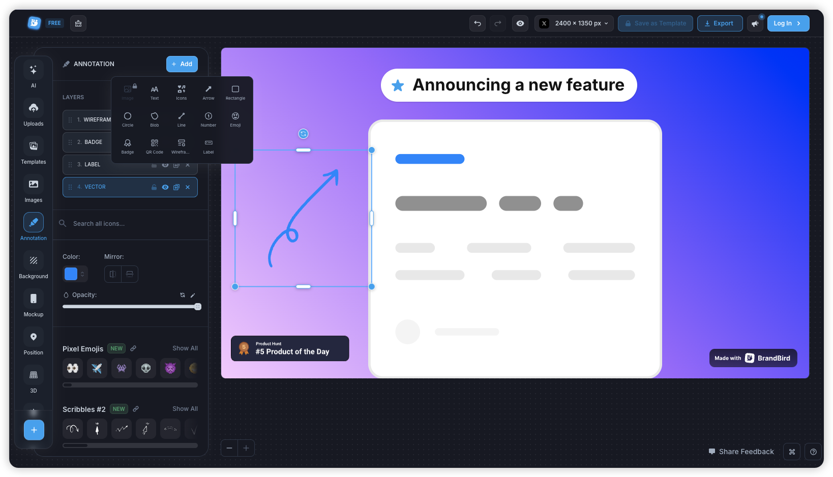 BrandBird 支持添加箭头、表情符号、文本框等注解元素,帮助用户突出关键信息,特别适合创建教程或产品功能展示内容。新的注解工具栏设计直观,操作更加便捷。