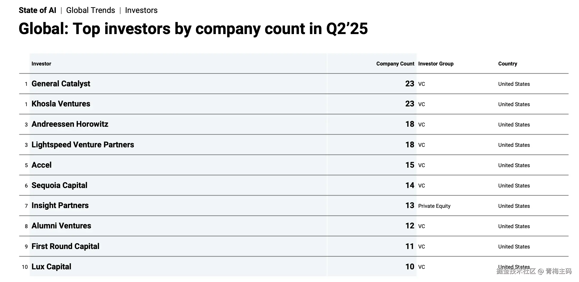 美国投资者在全球AI投资中占据主导地位,以下是 Q2 2025的顶级投资者: