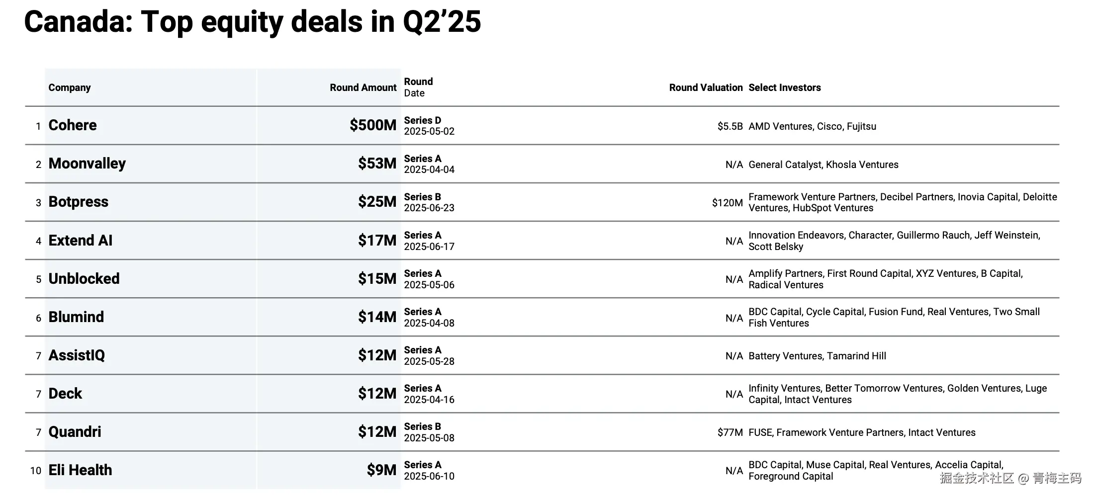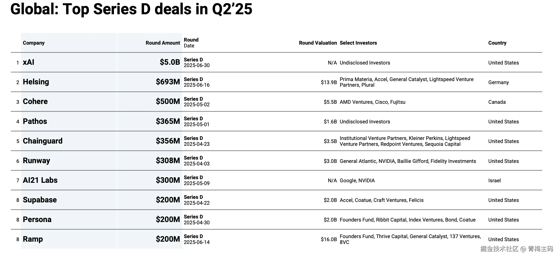 | D轮及以上 | Cohere | 加拿大 | 50亿美元 | 2025-05-02 | Framework Venture Partners等 |