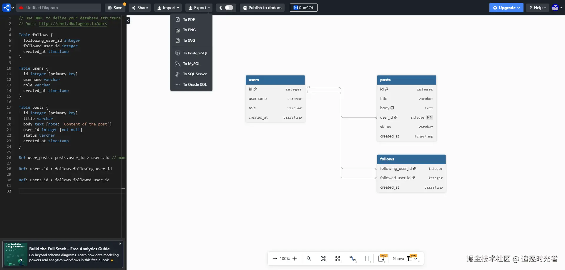 dbdiagram 是一款免费、简单、高效的在线图形化数据库设计工具,专为开发者和数据分析师设计。它可以通过输入 DSL(领域特定语言)代码来快速绘制数据库 ER 图。支持 MySQL、PostgreSQL、SQL Server 等多种数据库,支持 SQL 导入与导出(导出为 PDF/PNG/SVG)。