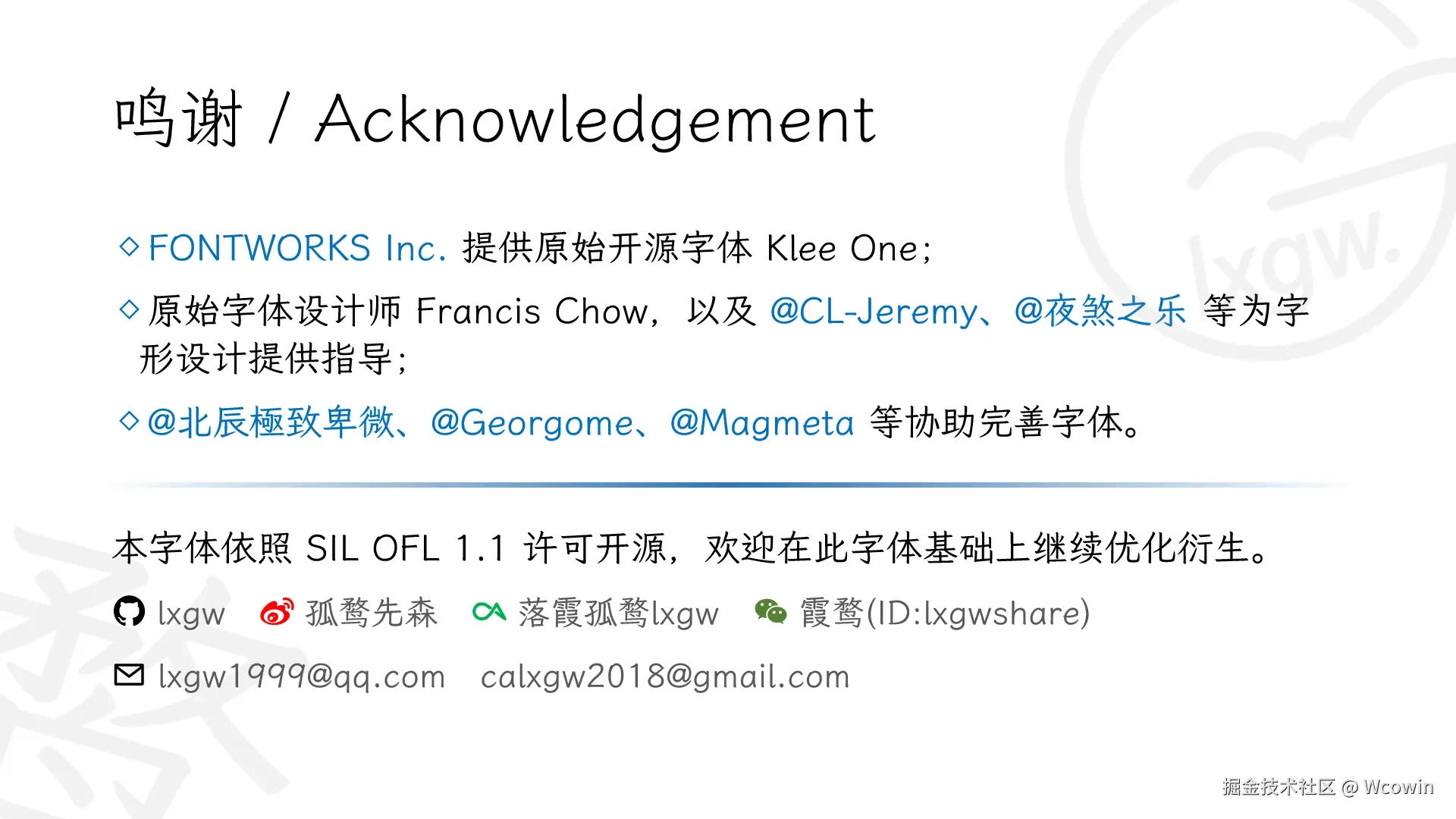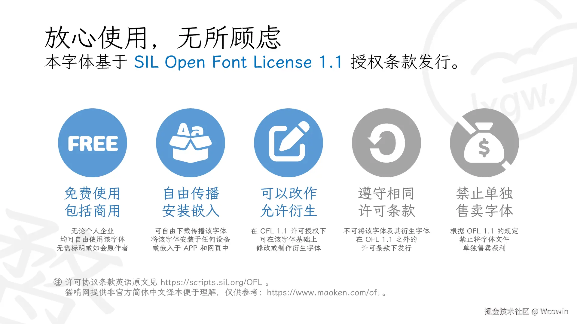 - 这款字体可以自由修改、改造,制作衍生字体。修改或改造后的字体也必须同样以 SIL OFL 公开。