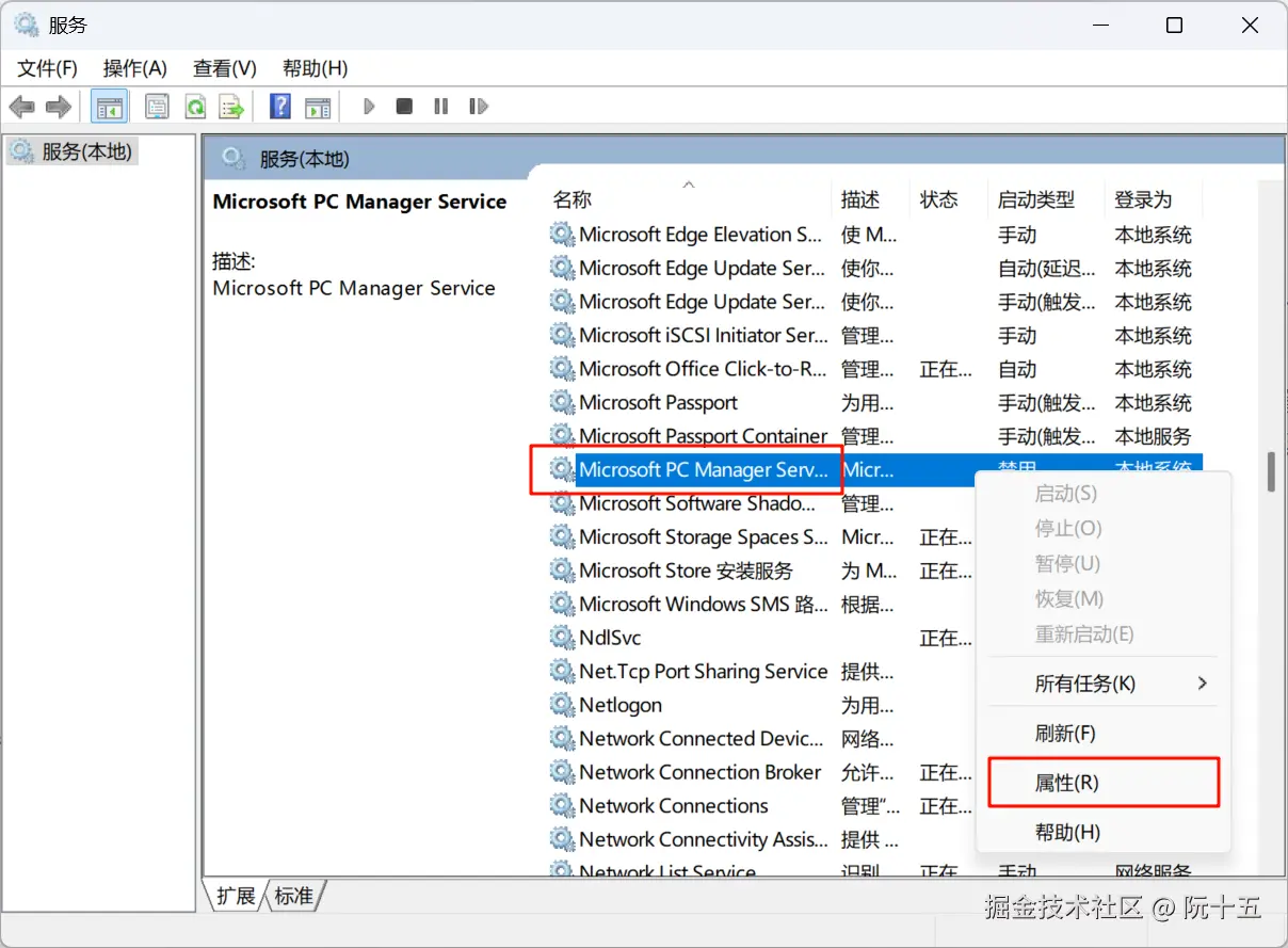 2. 找到名为“Microsoft PC Manager Service”的服务,右键选择“属性”