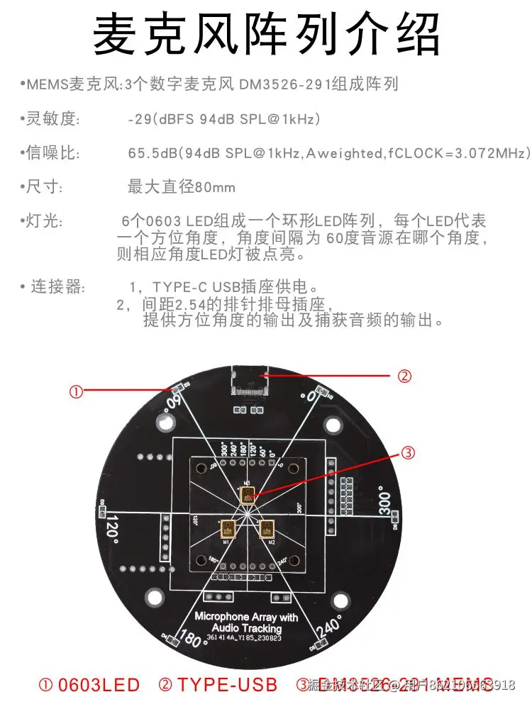 声源定位LED显示板主要是直观的观察声音定位算法的实际追踪效果.实际产品应用中是非必要的.显示板每隔60度一颗LED灯,可以根据声源方向.显示对应的LED灯珠.