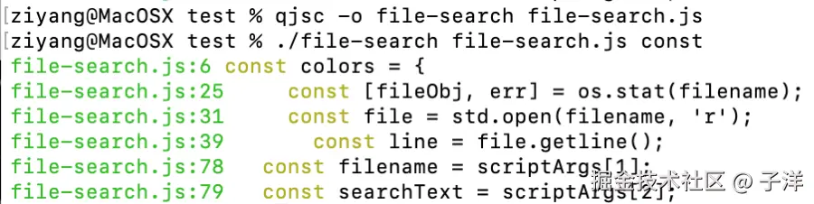 下面是一个使用 QuickJS 编写的文件搜索工具,功能类似 grep,用于查找文件中包含特定文本的行。