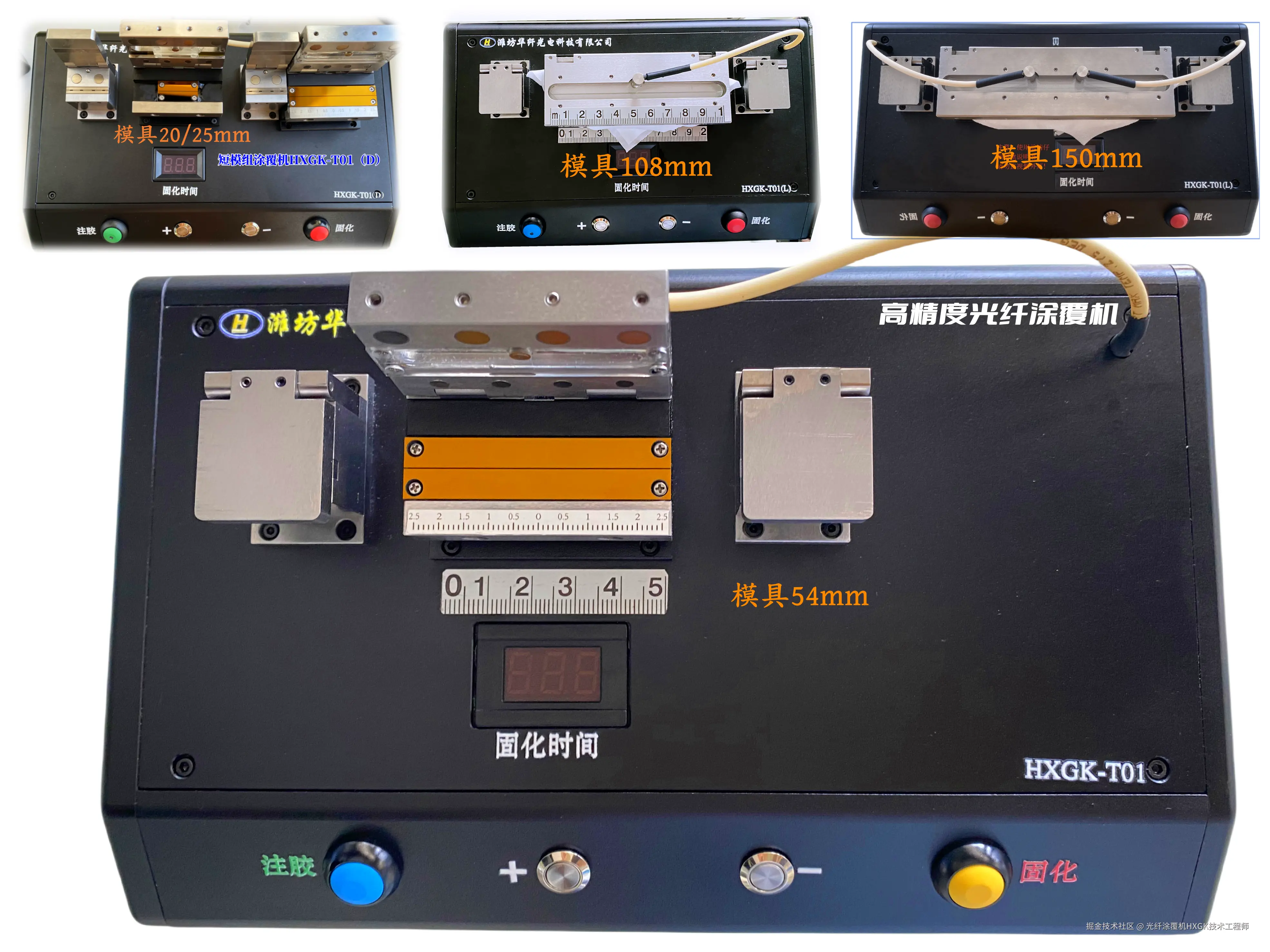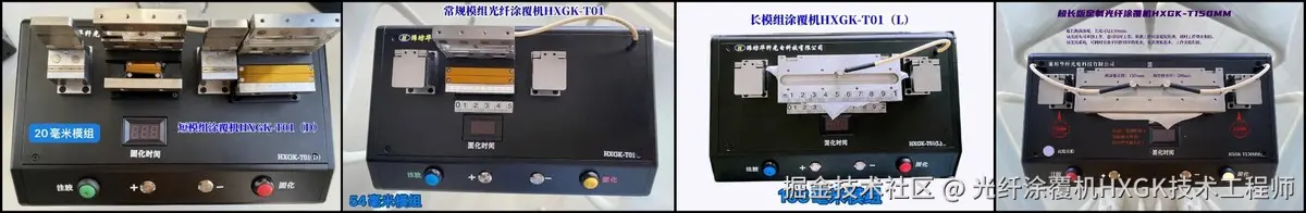 在产品矩阵构建上,我司提供覆盖全应用场景的型号体系:54mm 与 108mm 模组采用国际标准设计,对藤仓、Vytran 等进口品牌同类产品,实现国产化 替代与性能升级;同时,创新性推出行业领先的 20mm 超短模组与 150mm 超长模组,前者突破空间限制,适用于微型化光器件制造,后者则满足特种光纤的超长涂覆需求,为通信、传感、激光等领域提供定制化解决方案。