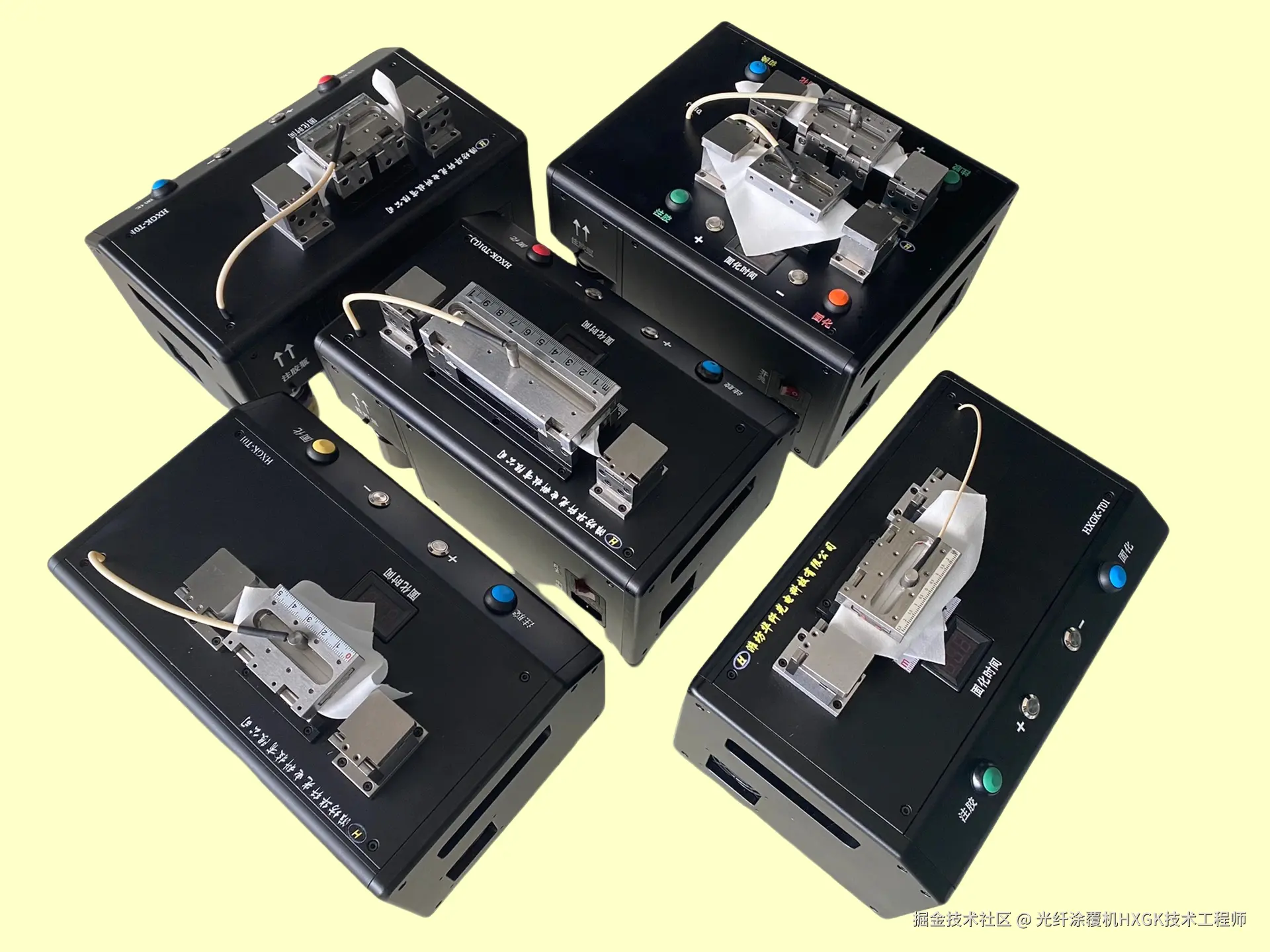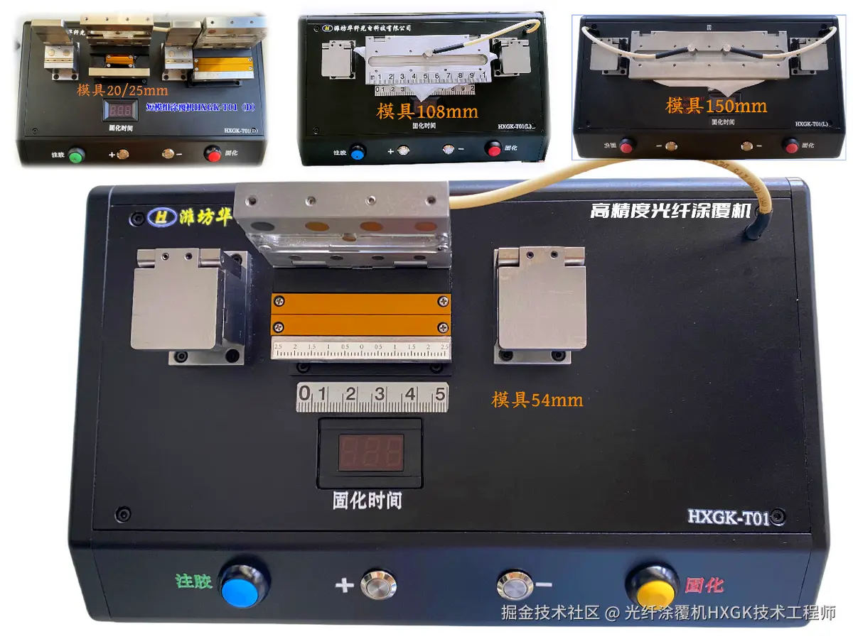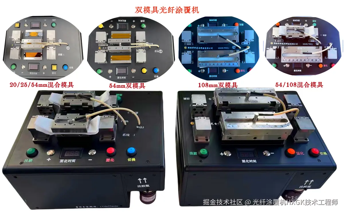 双模具光纤涂覆机HXGK-T02系列,高度集成双涂覆模具与双注胶系统,支持多种工艺组合:可同时用两种胶水、涂覆粗细光纤、灵活选两种长度涂层、实现内外两层同步复合涂覆;提供多种规格模组,还支持特殊模组定制。