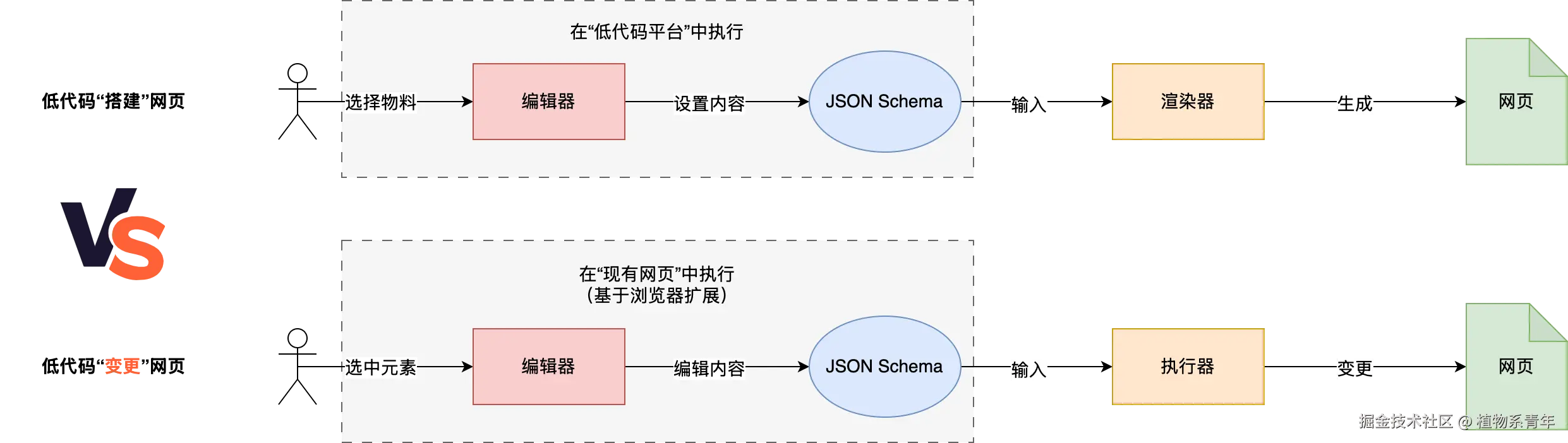低代码开发模式不仅适用于“搭建”页面的场景,同样适用于页面迭代更新的场景。在进行页面变更时,我们可以在现有页面中选中需要变更的元素,然后通过可视化编辑器对其进行编辑,如修改文本内容、调整位置、更改样式、修改类名以及其他属性值等。编辑结果同样以协议方式保存为 JSON Schema。当将 JSON Schema 输入到执行器中时,执行器会根据 JSON Schema 对现有页面进行动态变更,完成页面结构的动态调整与功能迭代。本文将深入探讨这一种用“低代码”的方式动态变更网页内容的模式。