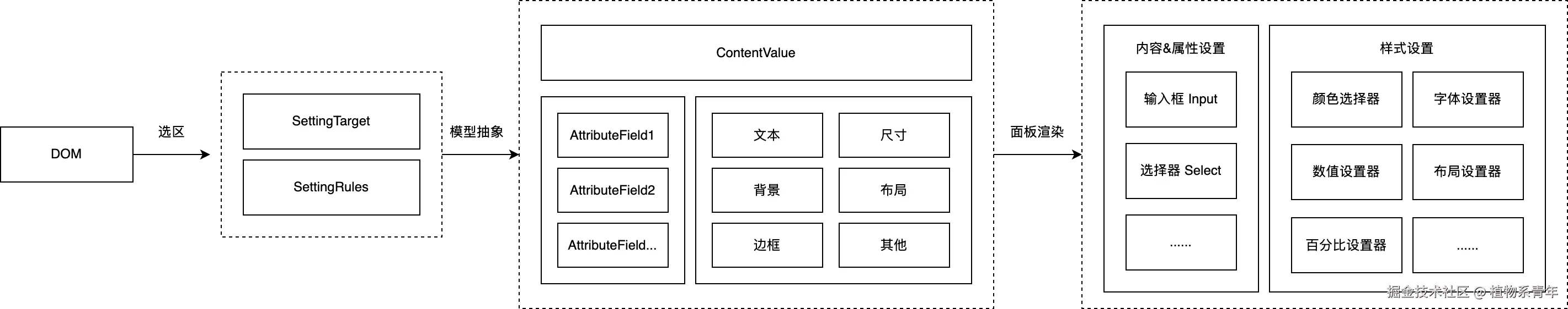技术实现上,我们把被选中的元素抽象为 SettingTarget;再由设置器规则集 SettingRules 给出它“能改什么、不能改什么”,确定当前 DOM 元素支持的设置器和对应的属性值,在设置面板中进行展示,设置器主要分为三种: