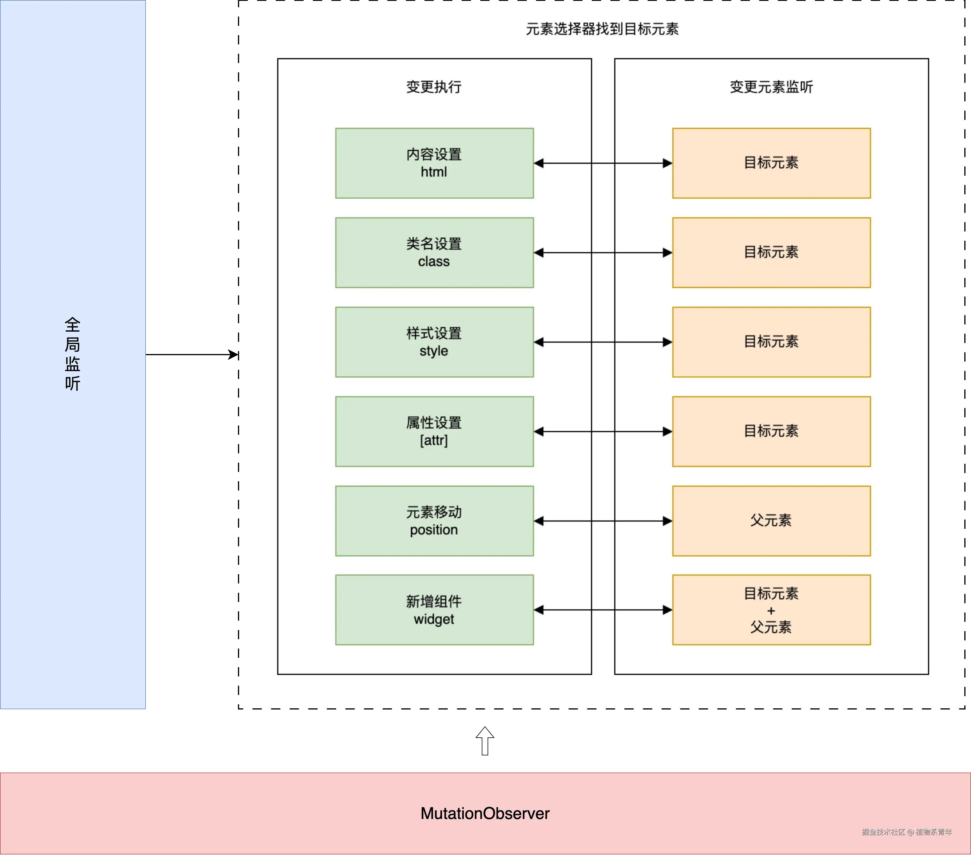 DOM 内容变更会根据元素选择器找到目标元素执行相应变更,并且对目标元素通过 MutationObserver 添加监听,当目标元素发生变动时会重新执行变更;同时开启全局监听,当前未找到目标元素但后续出现时会完成变更执行。监听页面变动以执行变更主要涉及两类监听: