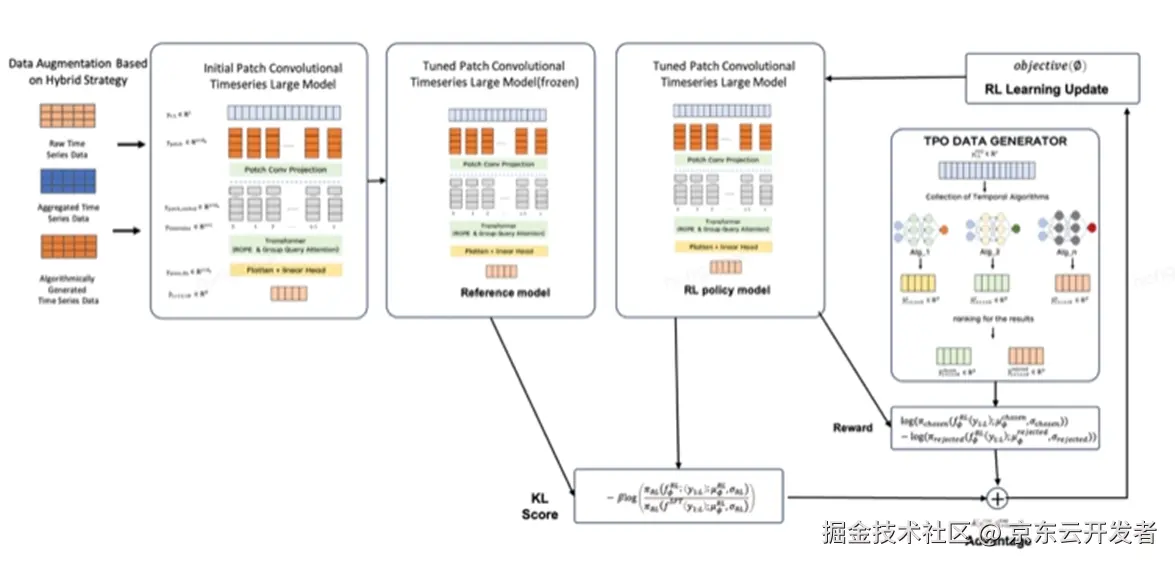 在大模型训练中,数据是基础。为了解决数据问题,京东供应链算法团队引入了一个包含15亿样本的大规模高质量复杂数据集,并提出了时序切分、数据配比和合成数据集构造等时序训练集构建范式。这些方法确保了数据的多样性和代表性,为模型训练提供了坚实的基础。在模型架构方面,团队提出了一个通用的PCTLM模型。该模型通过Patch的方式对数据进行切割,并在Patch投影的过程中进行了改进,以捕捉跨Patch间的信息。此外,团队引入了时间位置编码的分组注意力机制,进一步增强了模型对时序数据的处理能力。在垂类优化方面,团队首次提出了时间序列预测模型的RLHF方案,开发了一套适用于纯时序大模型的强化学习框架TPO。这一框架通过结合人类反馈和强化学习,显著提升了模型的预测精度和泛化能力。由于时序大模型的优异表现,京东算法团队已经将自研时序大模型在京东供应链系统部署上线,并取得了卓越的表现。预测准确率相较于线上大幅提升,验证了模型的有效性和实用性。