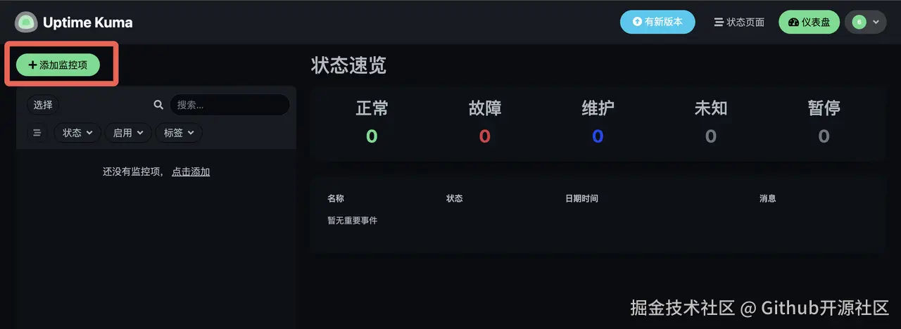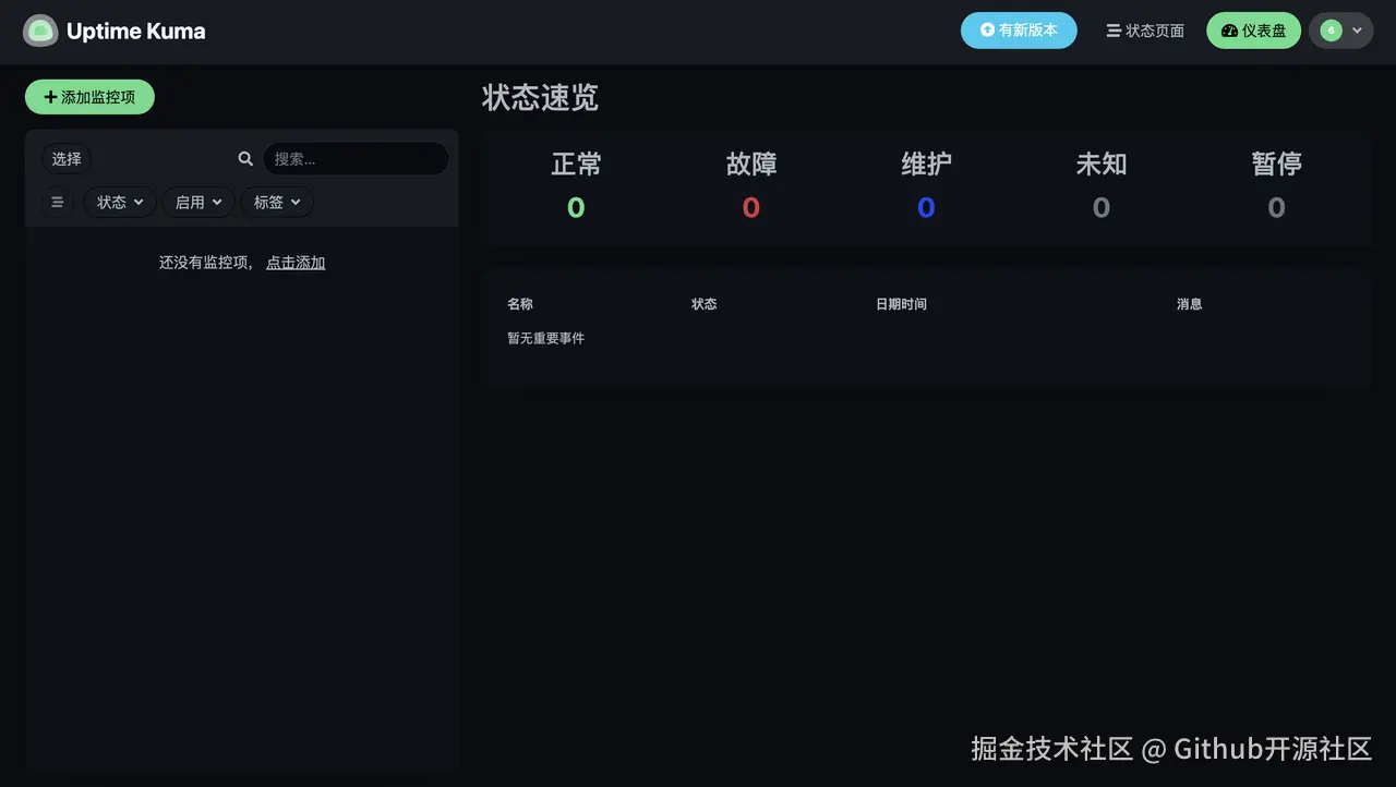 你就正式进入了 Uptime Kuma 的主仪表盘。一个专属于你的、7x24小时工作的监控中心,就此诞生!