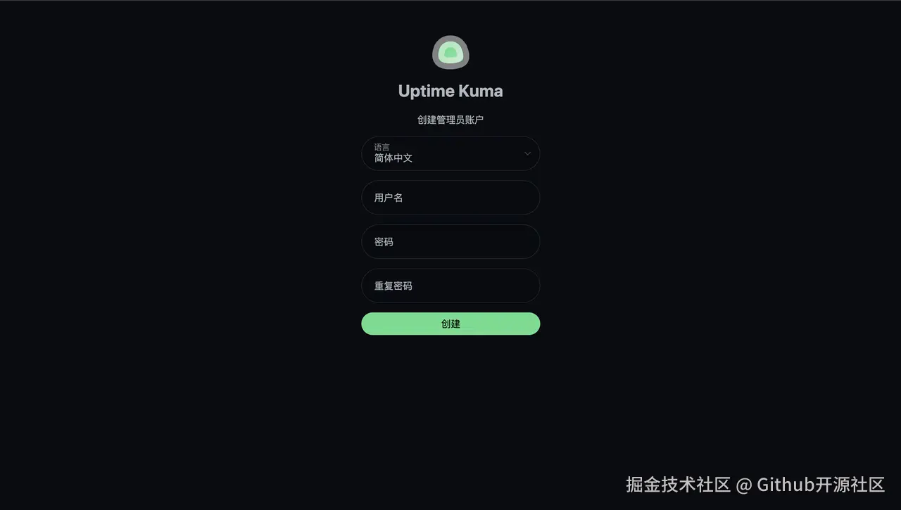 初次访问,Uptime Kuma 会引导你创建一个管理员账号和密码。