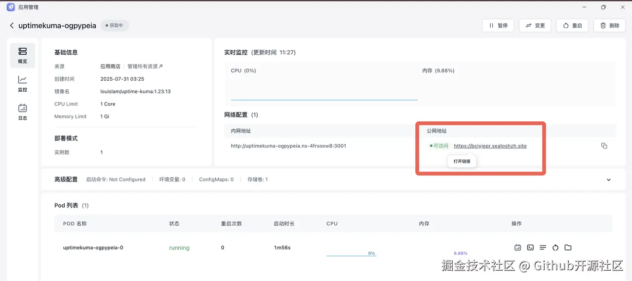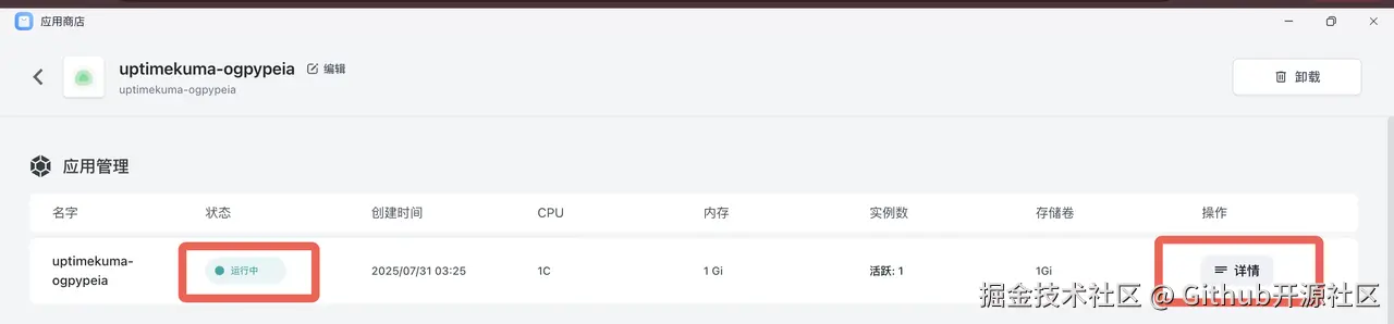 点击 Uptime Kuma 的卡片,进入应用详情页。