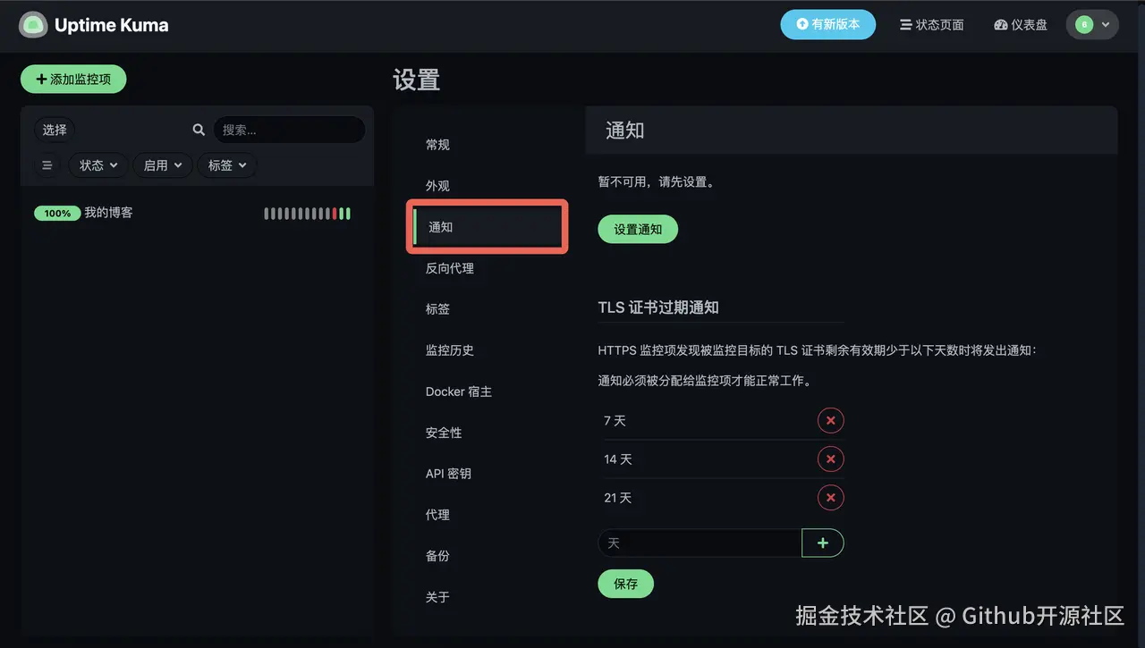当然,你还可以去“设置” -> “通知”中,配置你喜欢的告警方式。这样,一旦你的网站出现问题,Uptime Kuma 就会在第一时间通过你设置的渠道通知你。