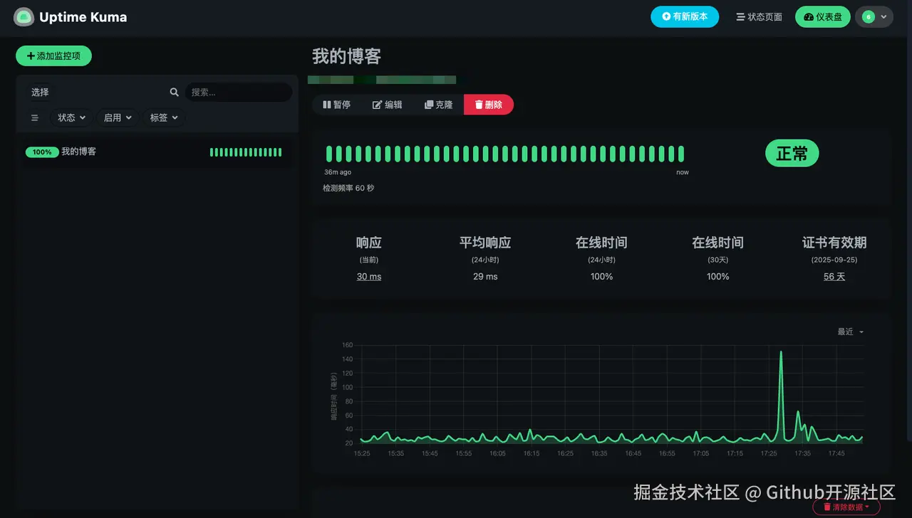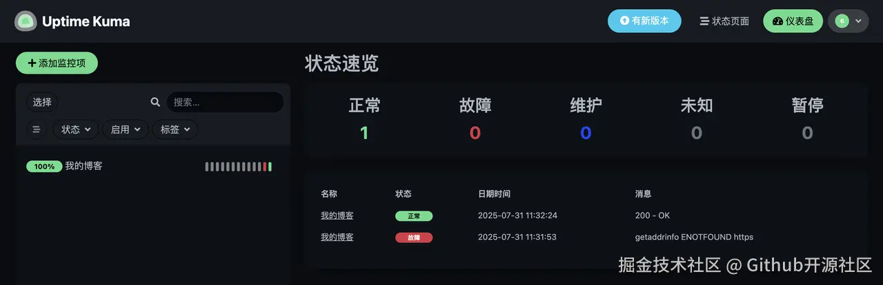 回到仪表盘,你会看到你刚刚添加的监控项已经开始工作了。它会每隔60秒检查一次你的网站状态,并通过绿色的“可用”状态条给你带来满满的安全感。