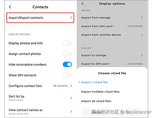 步骤 1:访问Android上的联系人,单击三个点菜单并选择“导入/导出”联系人。