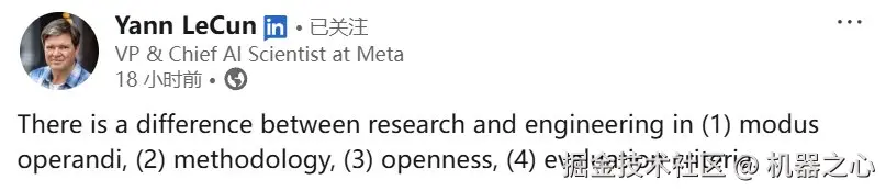 在链接的领英发帖中,LeCun 详细地从四个方面阐述了研究与工程的差异:运作方式、方法论、开放性和评估标准。