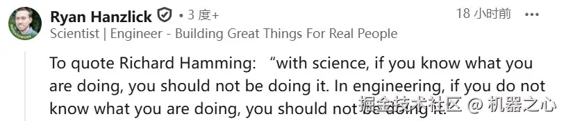 或许正如图灵奖得主、数学家理查德・汉明说过的那样:「研究科学时,如果你知道自己在做什么,你就不应该去做。做工程开发时,如果你不知道自己在做什么,你就不应该去做。」