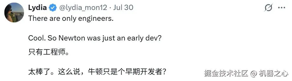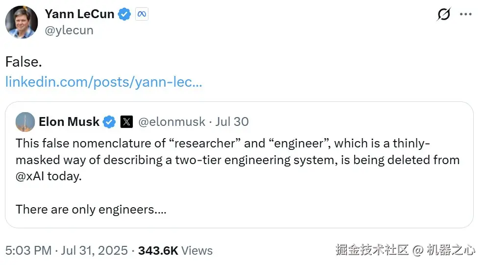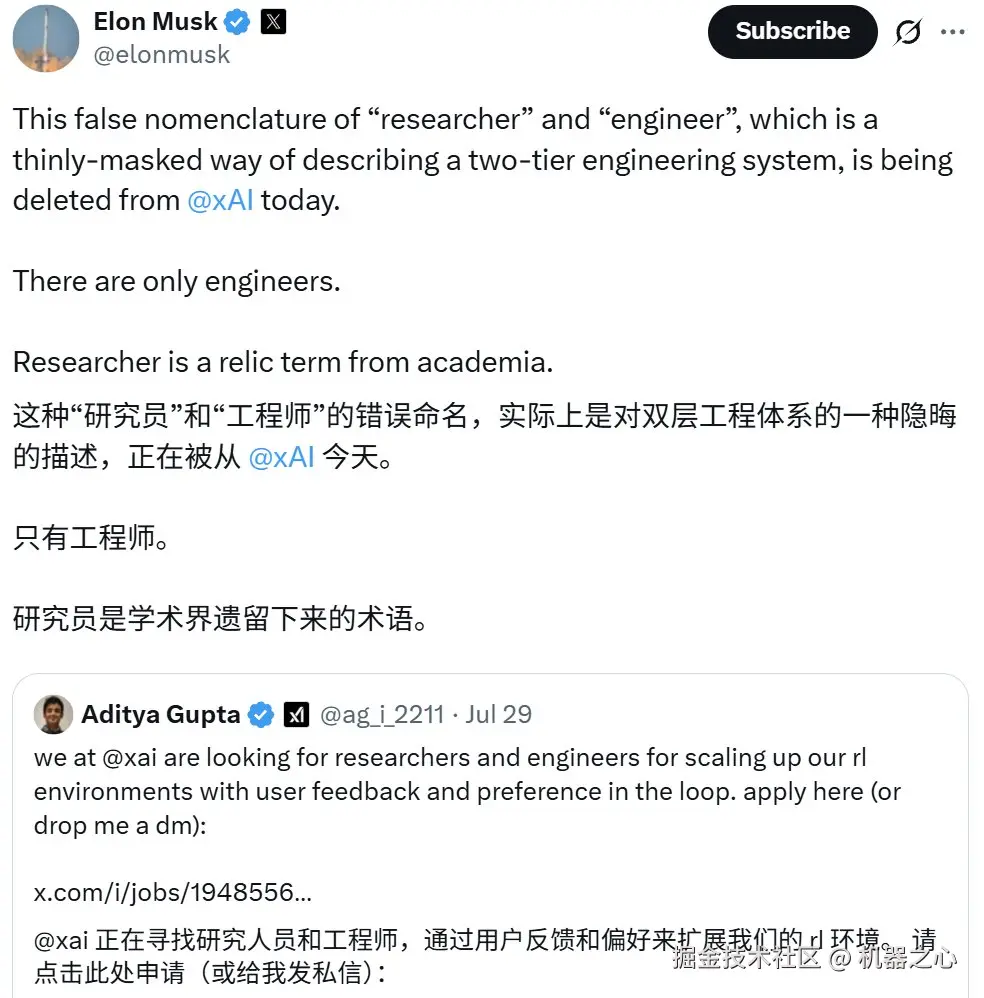 在转发 xAI 自家员工的招聘推文的评论中,马斯克宣称这种区分「研究员」和「工程师」的错误命名,实际上是对双层工程体系的一种隐晦描述。