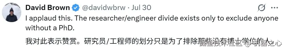 支持者中,工程师 David Brown 认为研究员 / 工程师的划分只是为了排除那些没有博士学位的人。