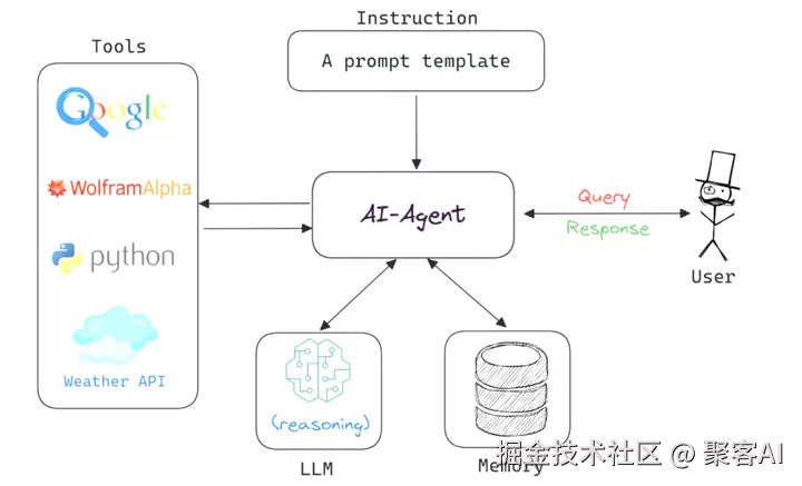 AI智能体是具备环境感知、逻辑决策和动作执行的自主软件。其核心工作流包含四个关键组件: