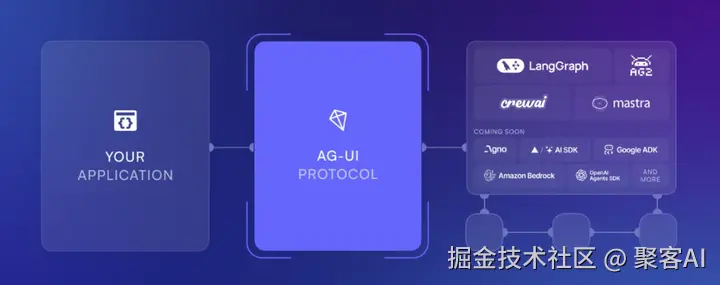 前端与智能体的双向通信标准:AG-UI 完善了 AI 协议栈,专注于构建 AI 智能体与用户前端之间的桥梁。它采用事件驱动的设计,定义了16种标准事件,并支持 SSE、WebSocket 和 Webhook 等传输方式,与 LangGraph、CrewAI 等框架兼容。
