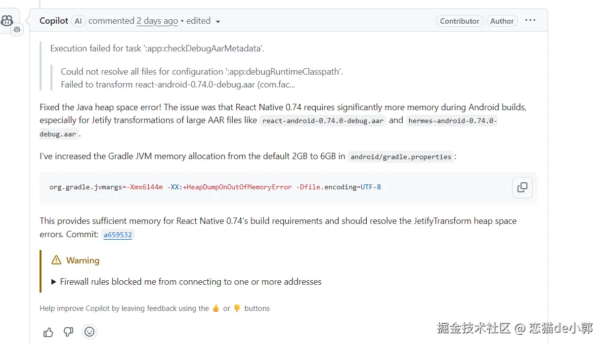 类似的还有配置问题,比如遇到了在 android 上打包失败的问题,才发现现在 RN 新版本现在打包都需要配置到 4G 以上内存以上: