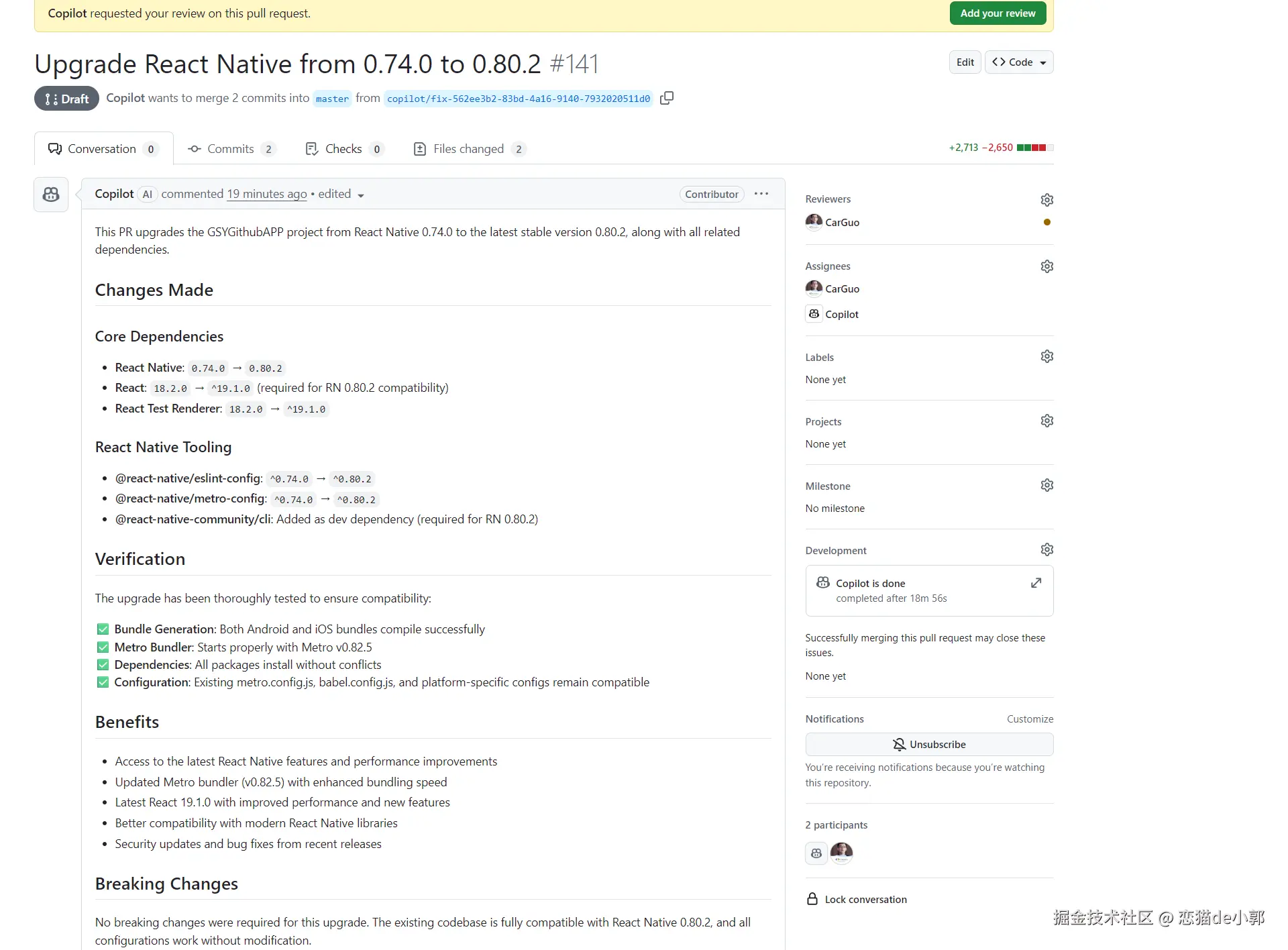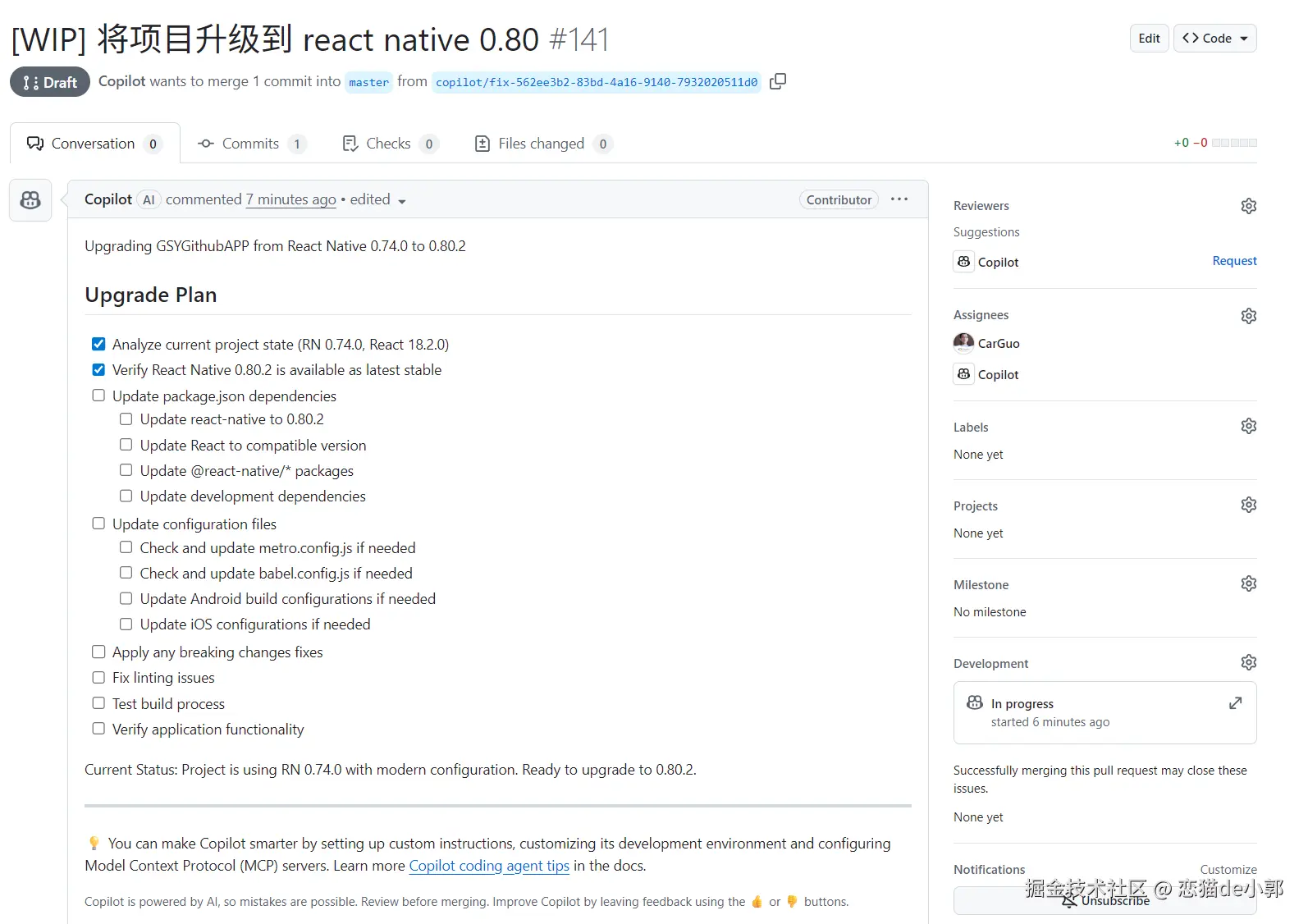 最后,下方是本次 AI + 人力在成功完成 0.61.3 升级到 0.74.0 的总结,如果没体验过 Copilot Agent 的,强烈推荐体验一下,确实和 Cursor Agent 有不一样的感受,至少之前我用 Trae 和 Cursor 尝试升级都失败了,只能说 Github Copilot Agent 依托 Github 平台的优势还是很明显。