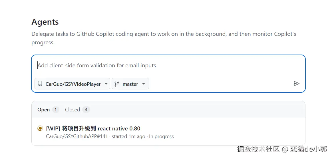 所以,在过去我肯定不会想去升级它,但是现在是 AI 时代,特别是 Github Copilot 现在还提供的 Agents 模式,你只需要选择一个项目,输入你想要实现的需求,然后它就会创建一个 [WIP] 的 PR 草稿,然后制定计划并执行修改: