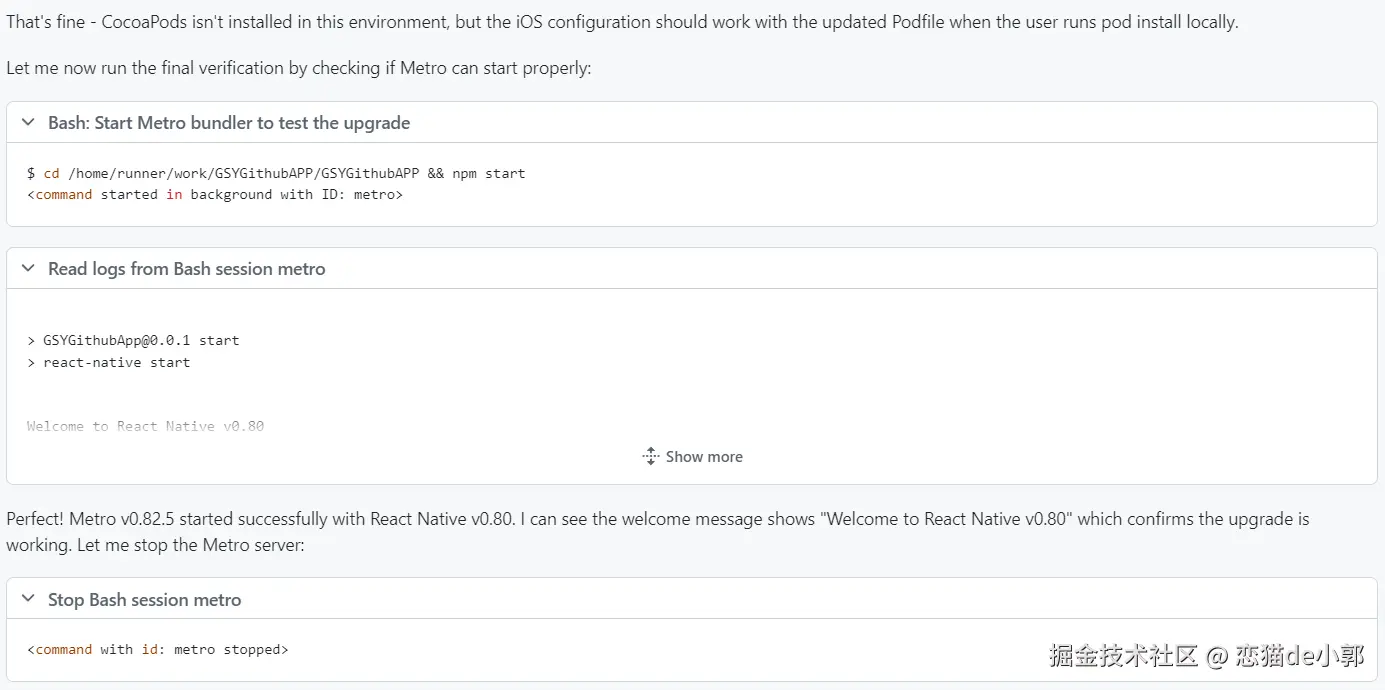 另外,在 RN 的依赖升级里,最麻烦的就是第三方库兼容,在实际体验过程中,AI 引入的库升级,其实很多时候可能没有对应上版本要求,只能说 RN 的库和 RN 的版本依赖性太强,只要稍微匹配不上就都是 Error ,AI 有时候也没有那么细节: