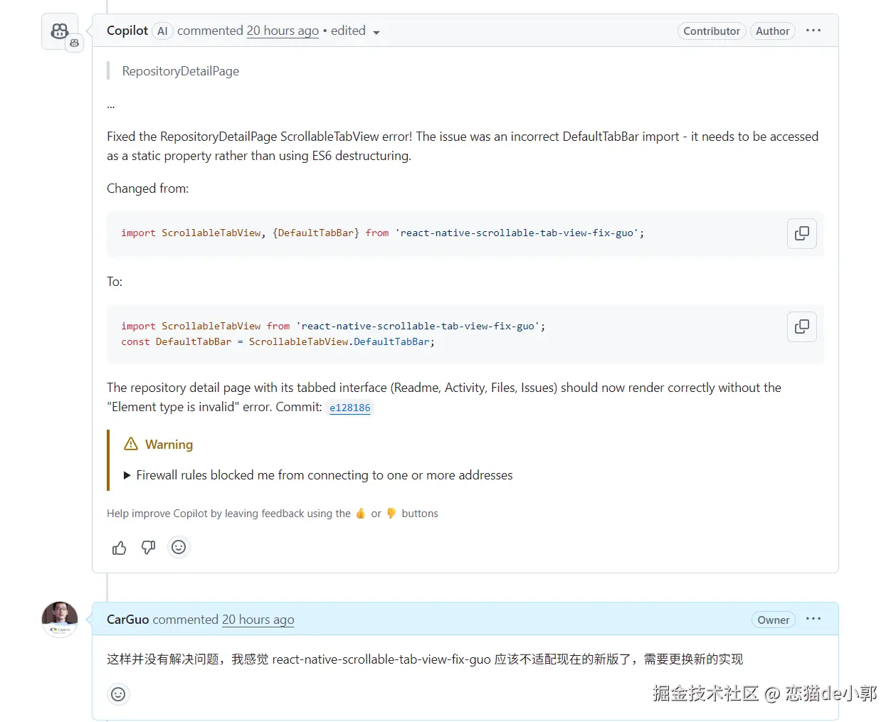 当然,有些库 AI 一直觉得可以适配,但是实际在根本无法兼容,比如 react-native-scrollable-tab-view 依赖的各个库版本和 API 都太低,根本无法直接适配,所以我让 AI 直接替换为新的实现,这才是 AI 的优势: