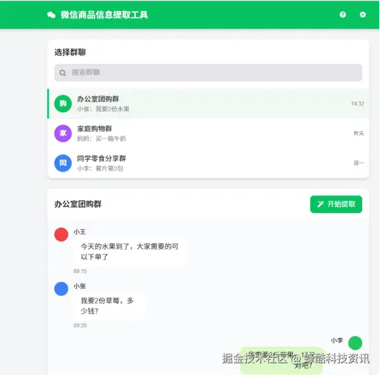 我的痛点很具体,每周都要手动汇总公司几个微信群里零散的团购订单信息(商品、数量、金额、人名),再整理成Excel表格给财务。每次都要花1-2小时,眼都看花,还容易出错。