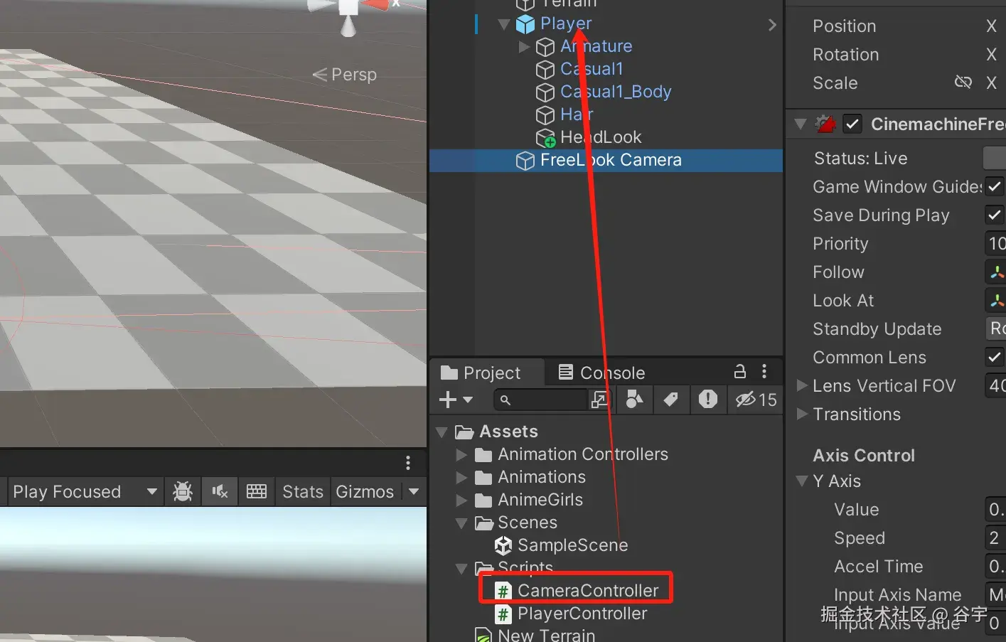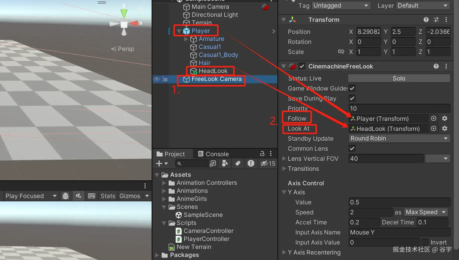 2.在自由摄像机里有一个Follow和LookAt。Follow:我们把角色拖拉过去。LookAt:我们就把角色的头部的“面朝向的点”拖拉过去。