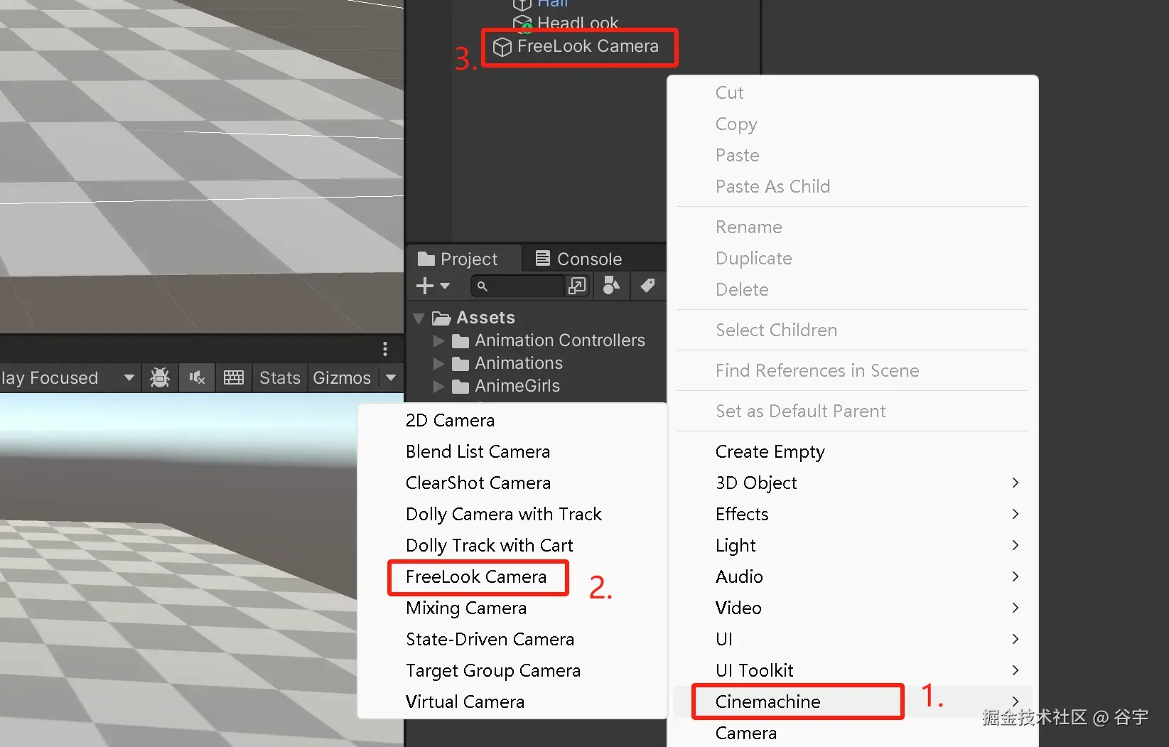 1.我们需要创建一个自由摄像机。点击右键,选择Cinemachine,创建一个自由摄像机(FreeLook Camera)。