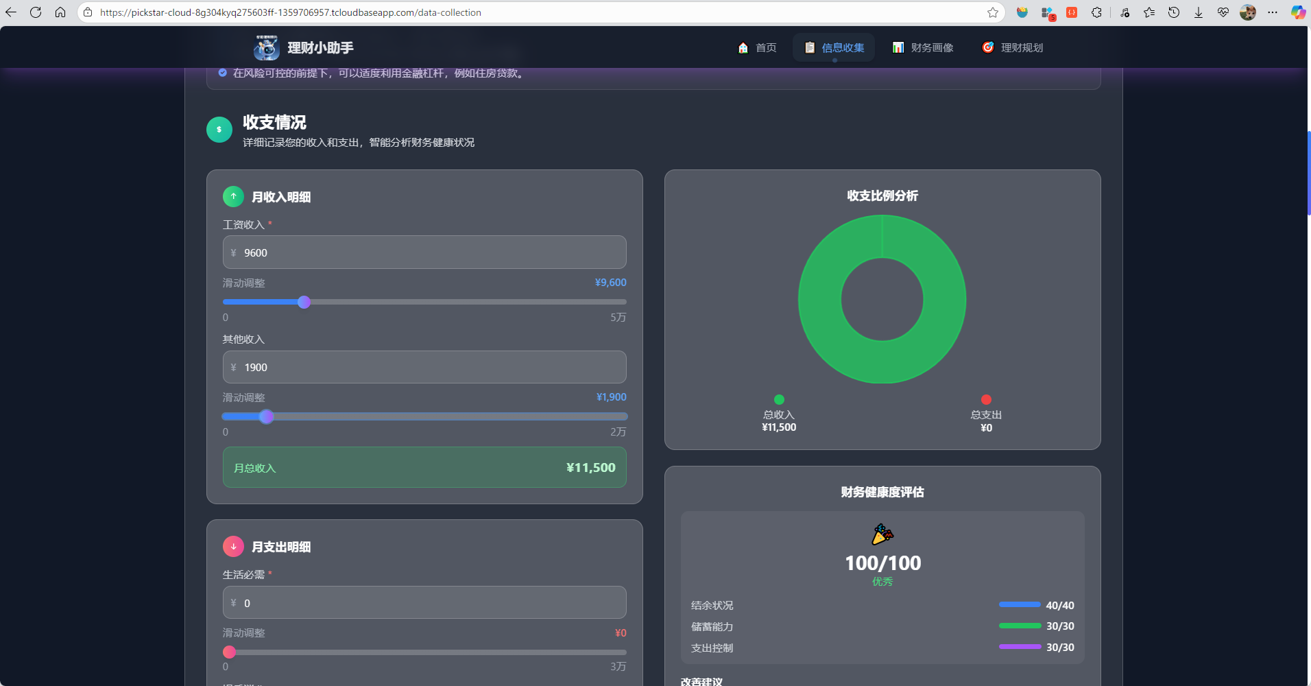 **目标**: 通过友好的交互界面收集用户基础财务信息功能特性