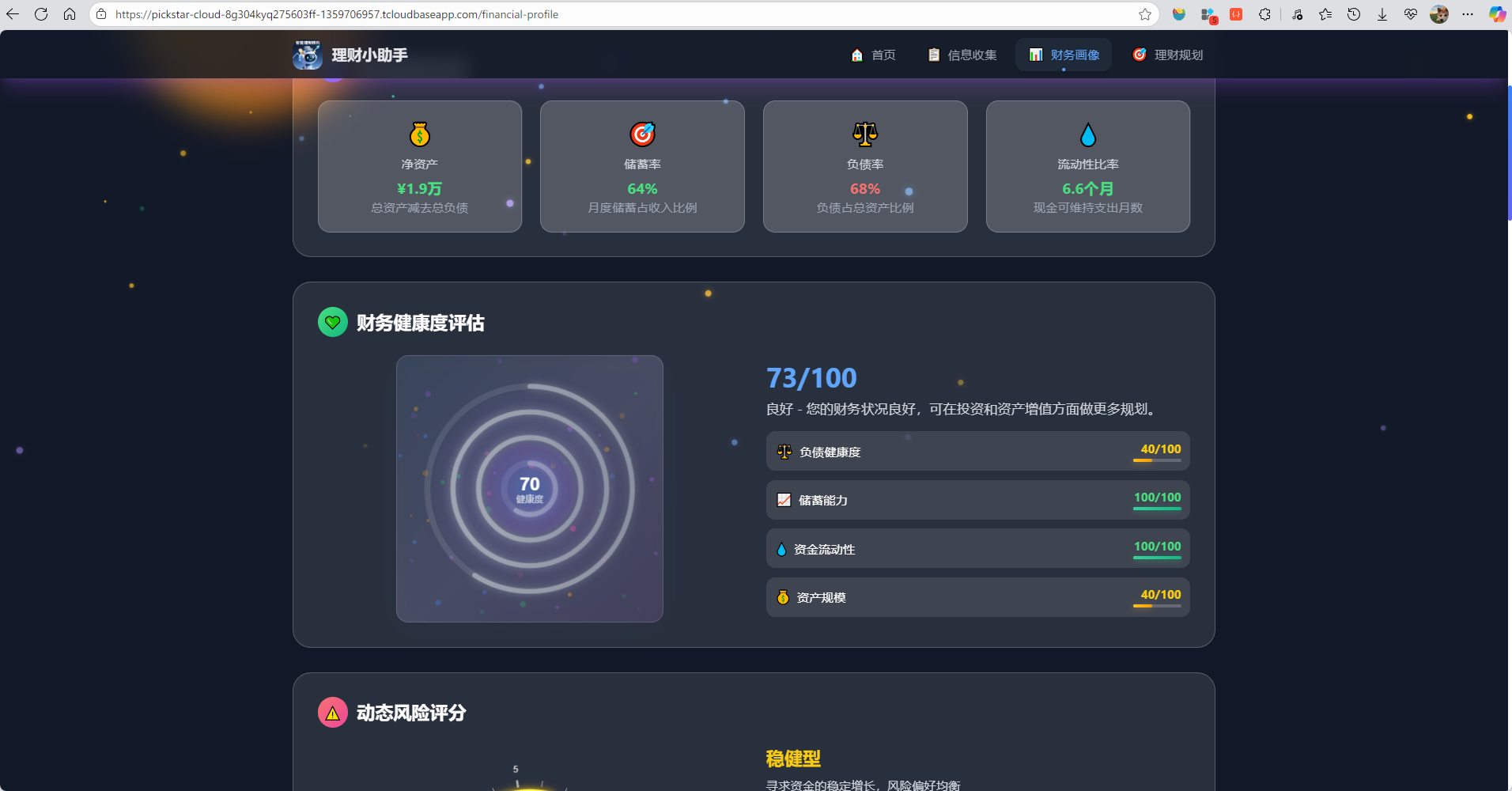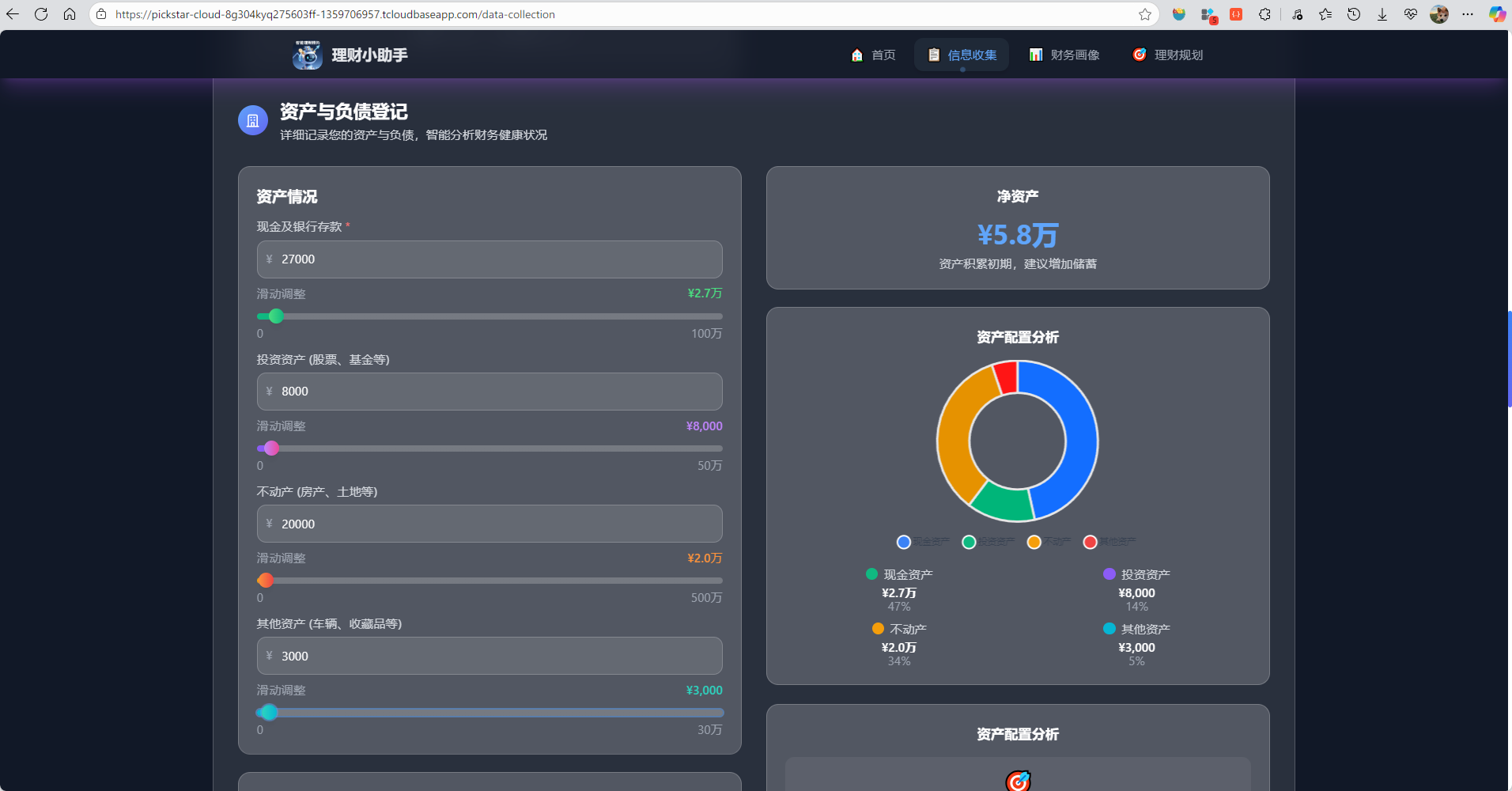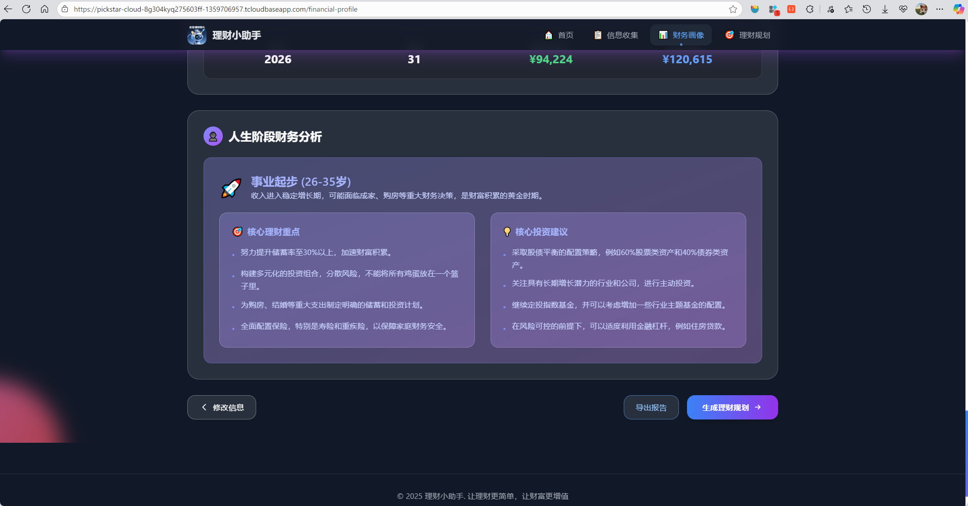+ 采用卡片式布局,每个信息项独立展示 + 使用渐变色彩和微动画提升视觉体验 + 移动端优化:大按钮、易点击的表单元素 + 加载状态和成功提示的友好反馈模块二:财务画像分析系统