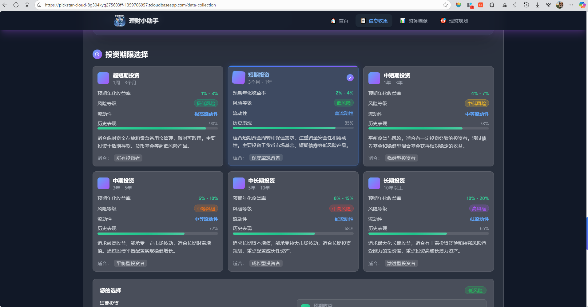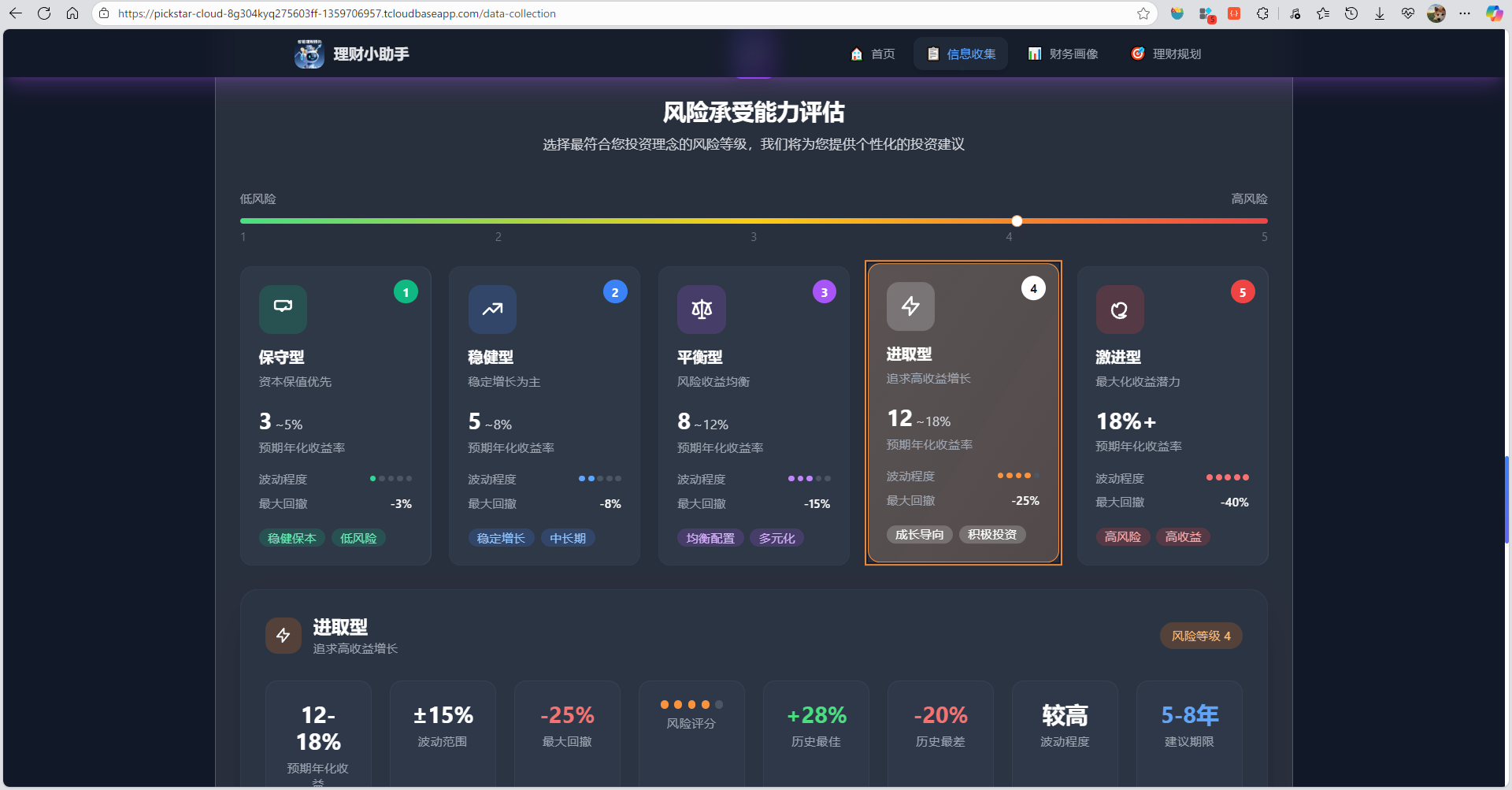 3. 风险画像构建:基于用户的风险偏好描述,结合年龄、收入稳定性等因素,生成1-10级风险承受度评分