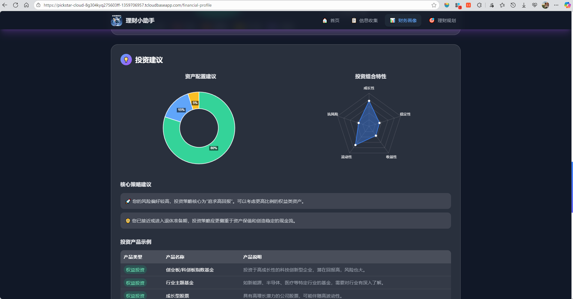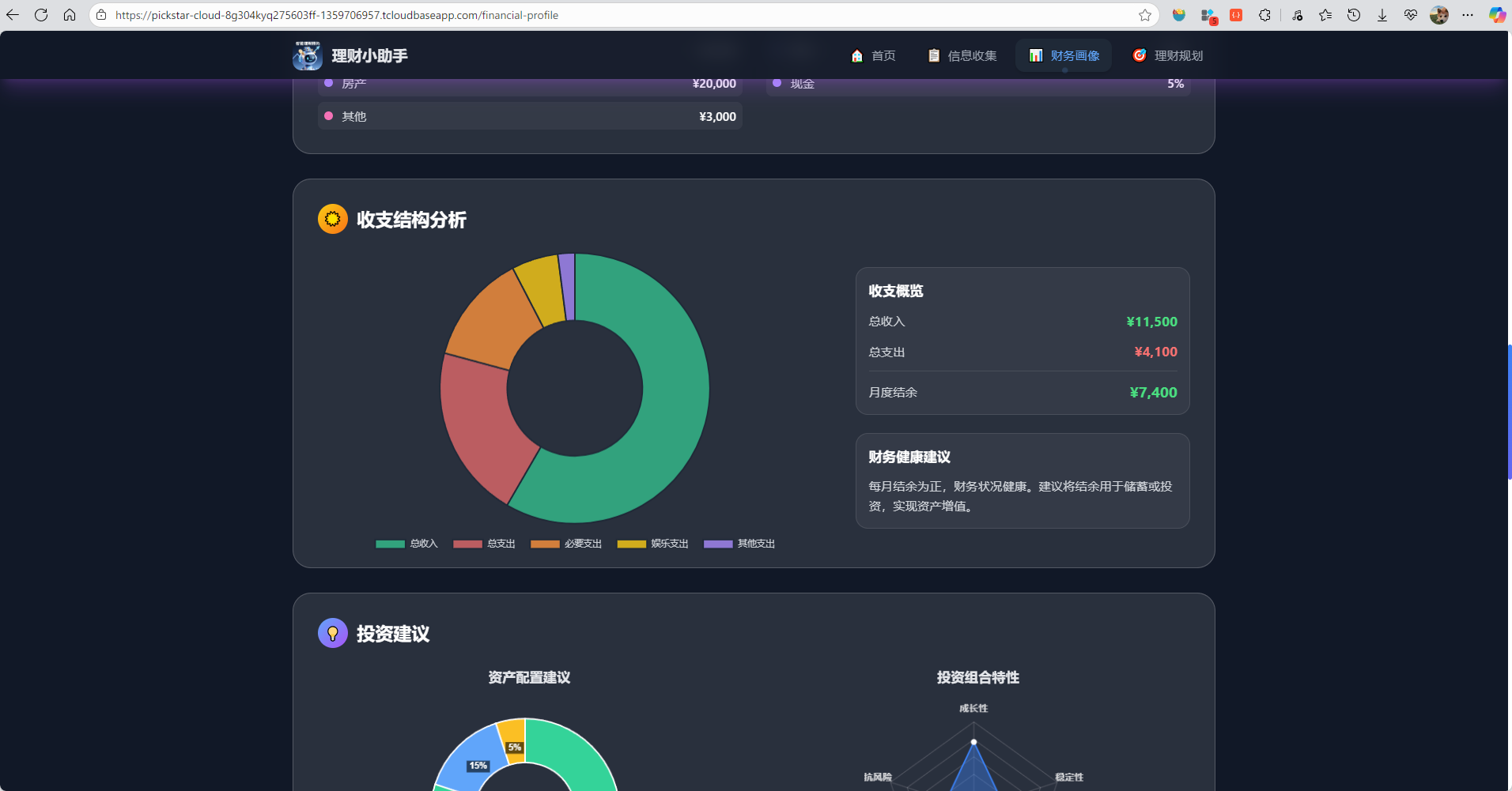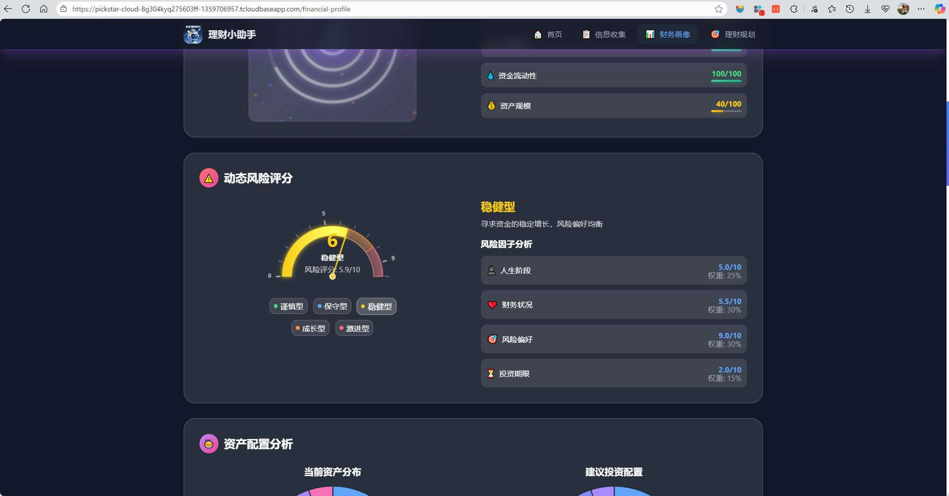 6. 标准化报告生成:将所有分析结果整理为可视化结构化数据,包含用户画像、财务指标、风险评级、目标分析等模块展示(可自行扩展)